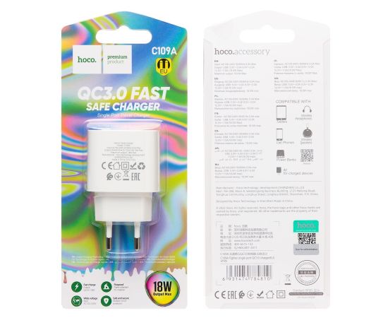 Адаптер Сетевой Hoco C109A Fighter single port QC3.0 (white) (214010)