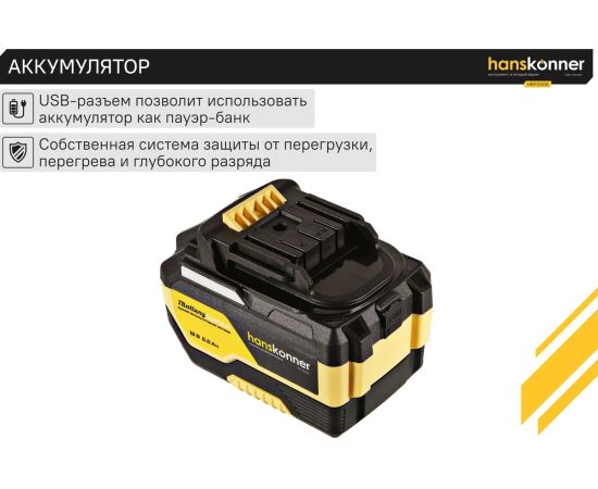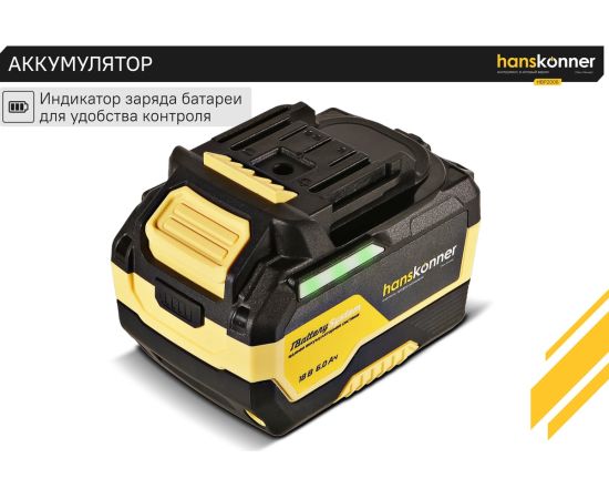 18-вольтовый аккумулятор HBP2006 Hanskonner емкостью 6.0 Ач обеспечивает впечатляющую мощность и совместим с любым инструментом единой аккумуляторной системы 1BatterySystem.