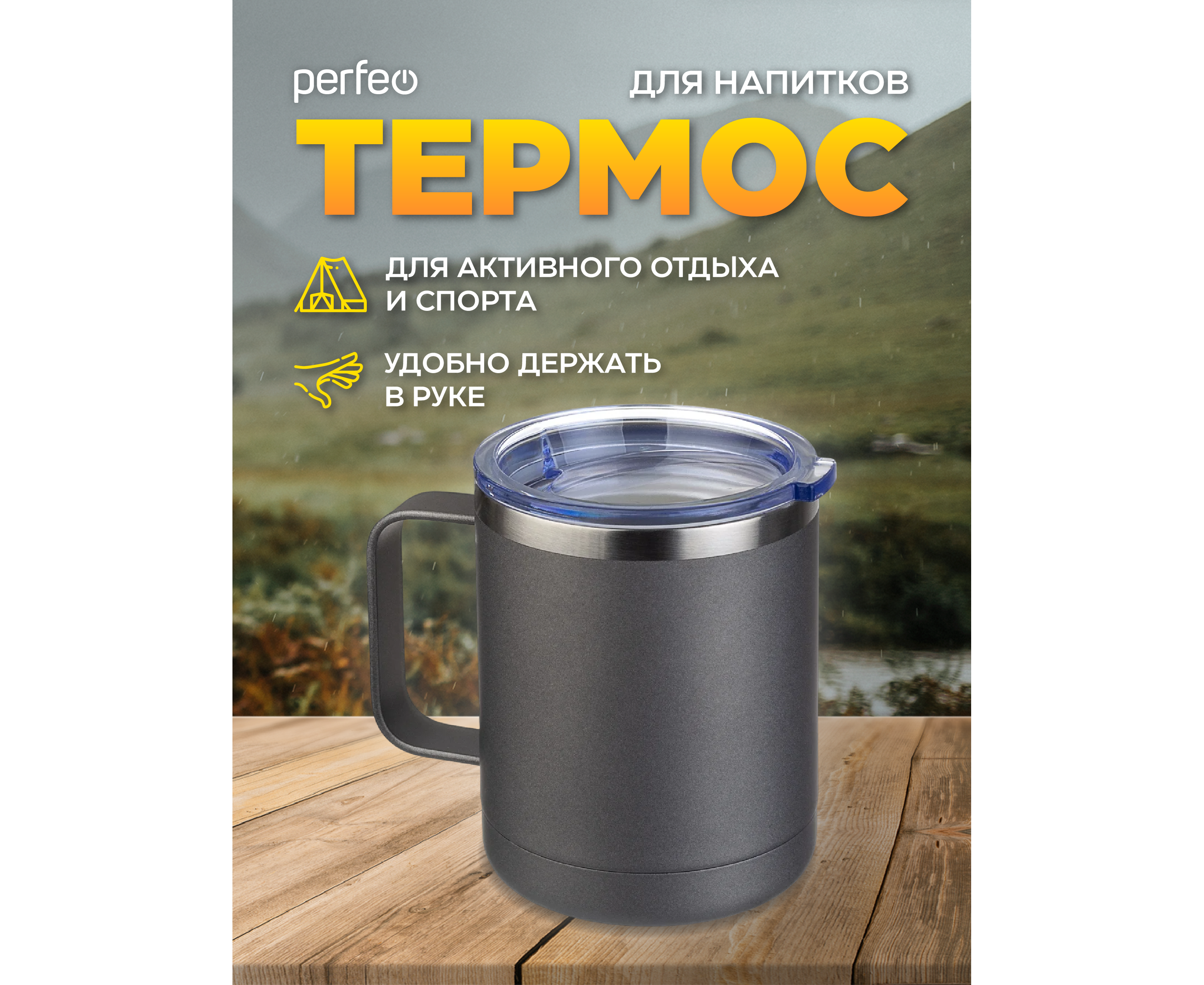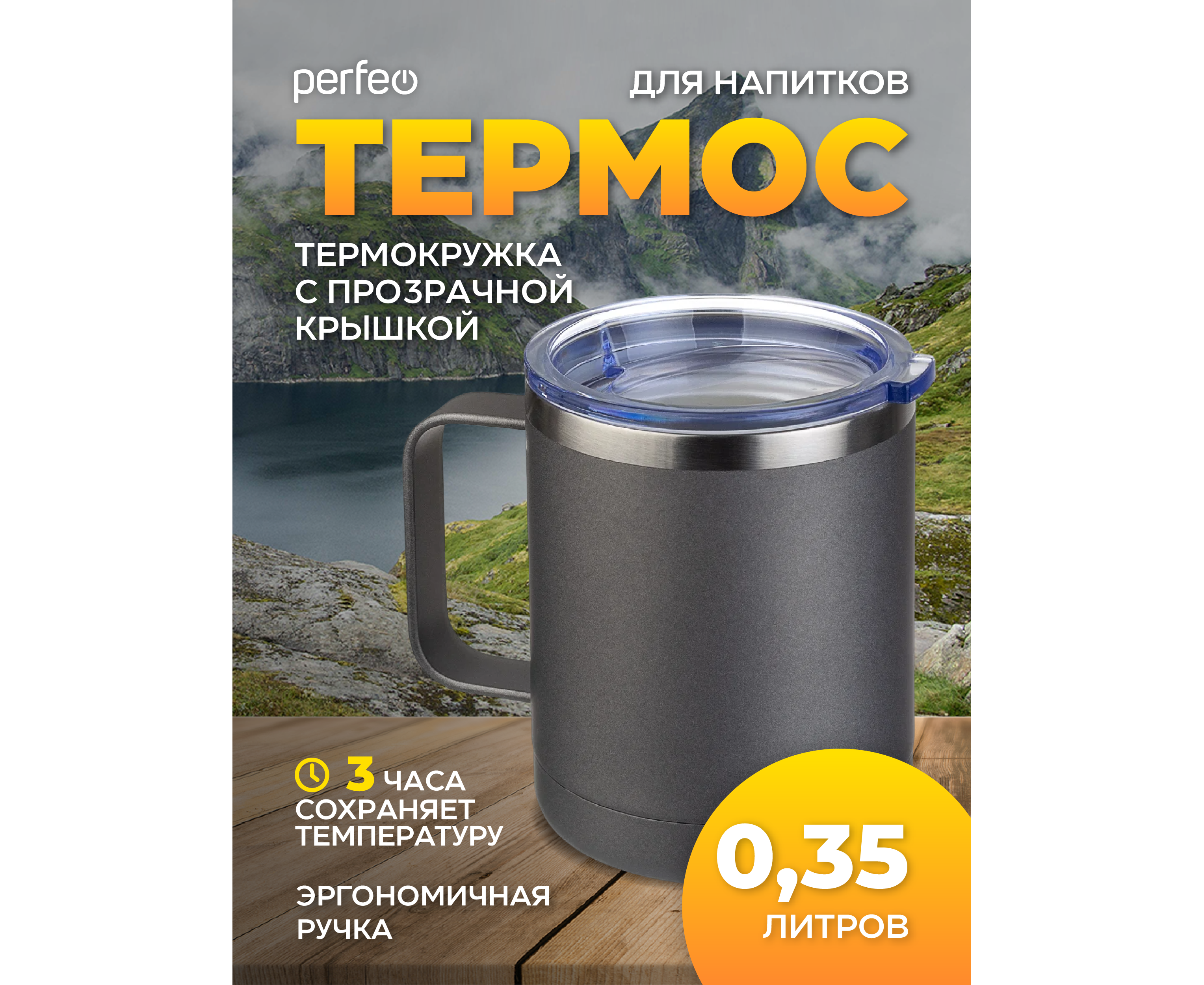 Акция !!! Термокружка для напитков PERFEO с прозрачной крышкой, ручкой, объем 0,35 л., серый (PF_C3731)