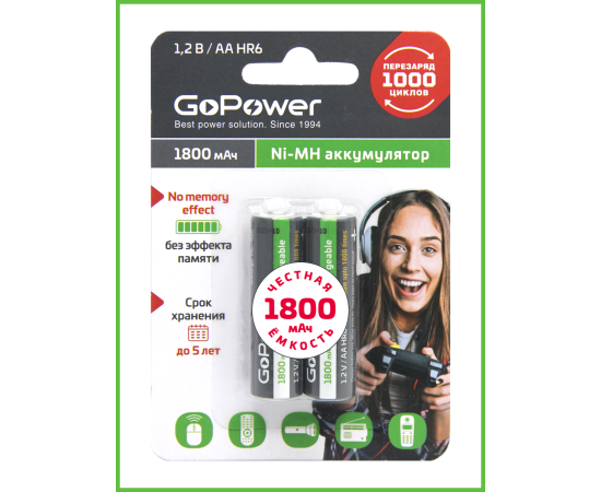 Аккумулятор бытовой GoPower HR6 AA BL2 NI-MH 1800mAh (2/20/240)