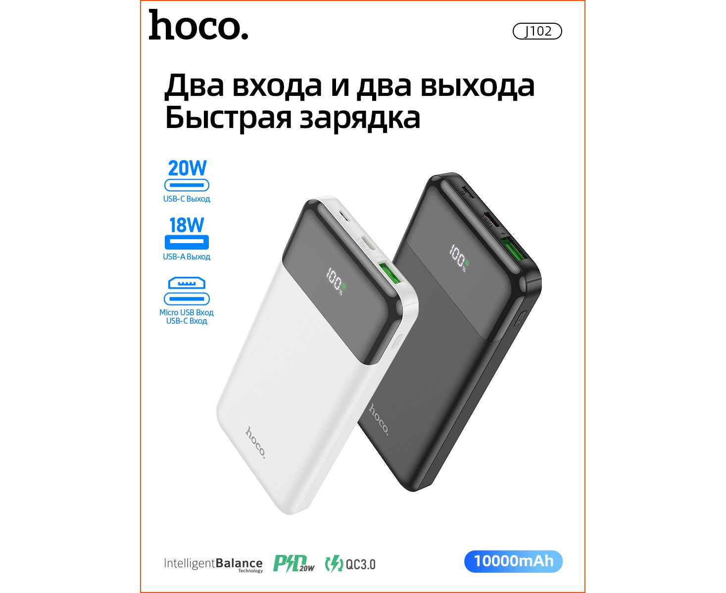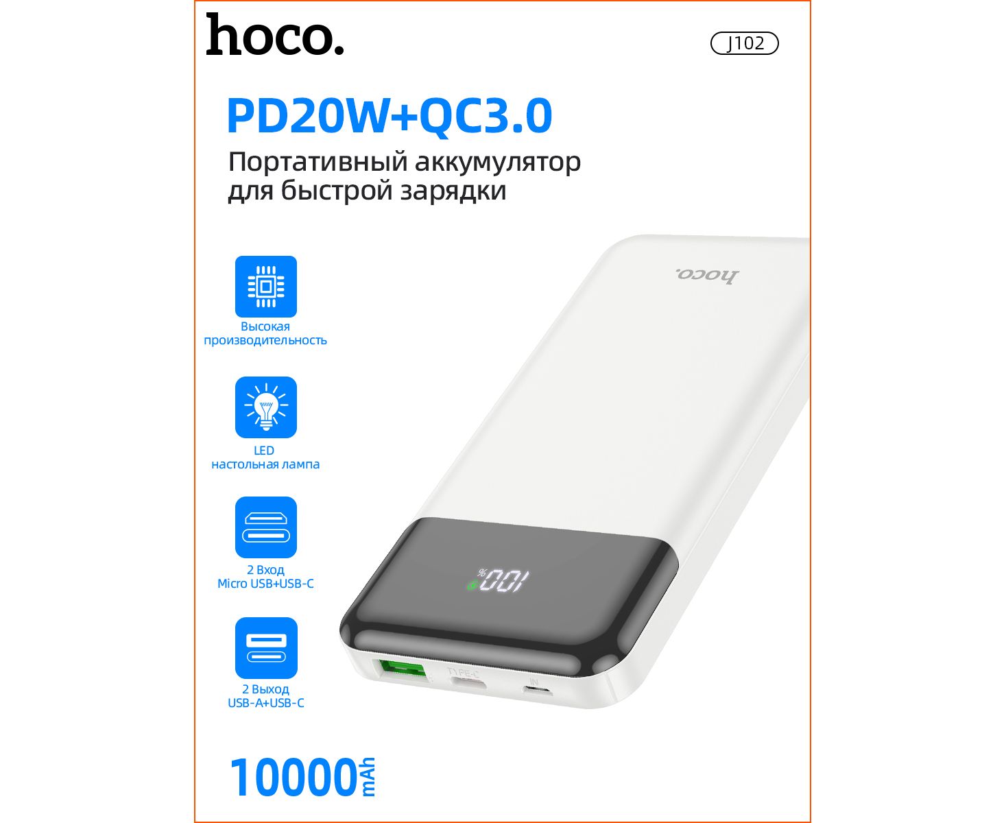 Аккумулятор внешний резервный HOCO J102 10000mAh Cool figure PD20W, QC3.0 (белый)