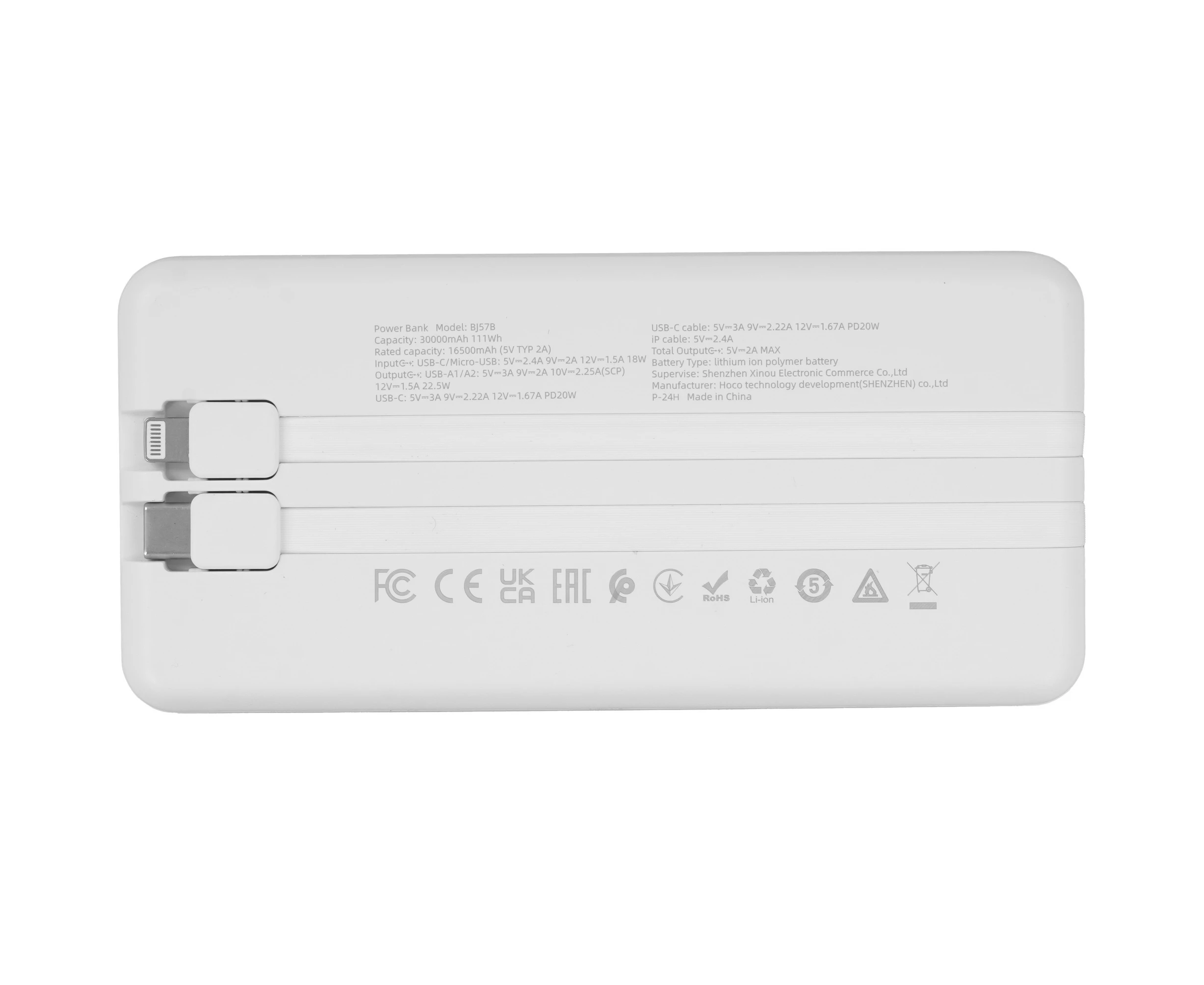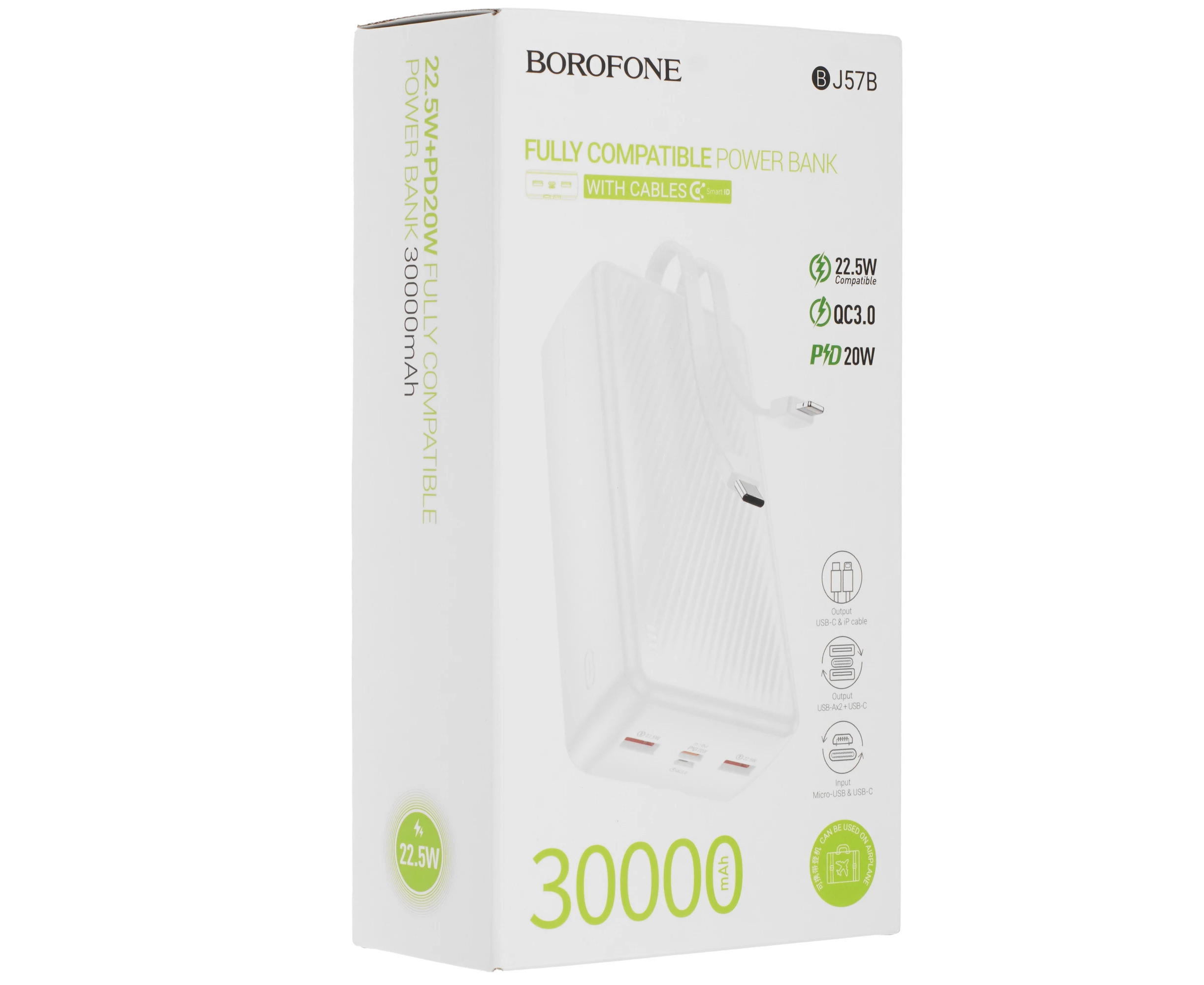 Аккумулятор внешний резервный BOROFONE BJ57B 30000mAh 2USB 2.4A 22.5W PD 20W быстрая зарядка с LED-индикатором (белый)