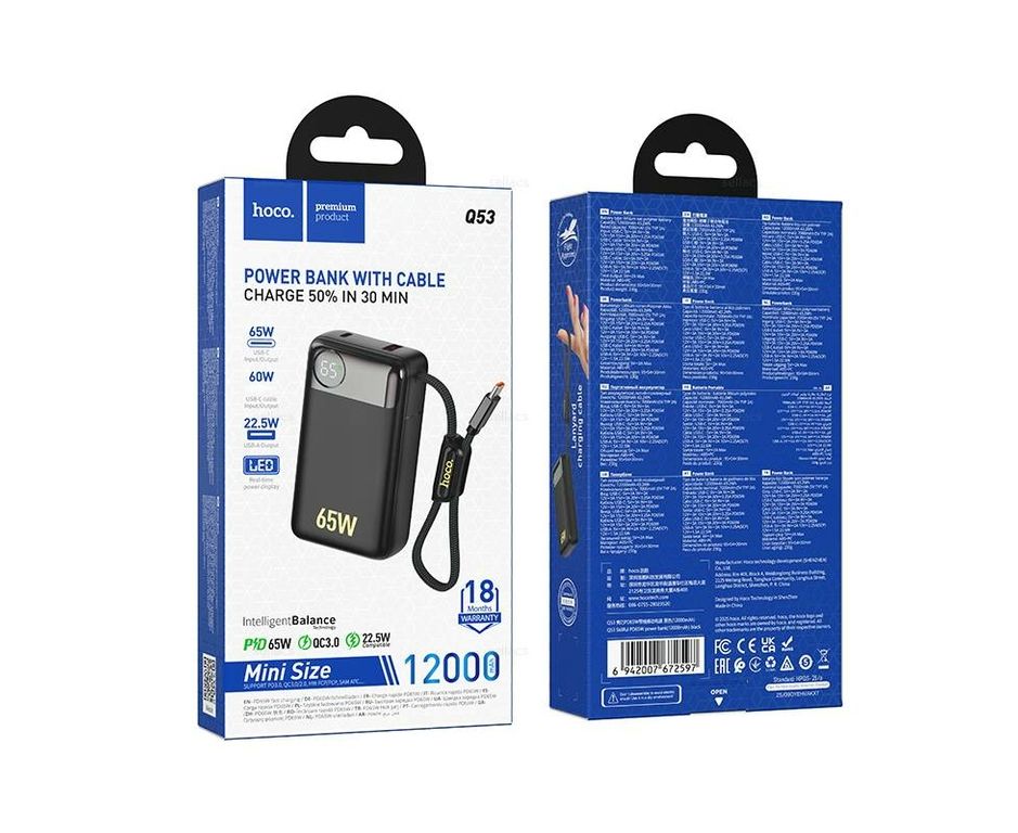 Hoco Q53 Skillful — это компактный, но мощный внешний аккумулятор с поддержкой быстрой зарядки PD65W и QC3.0, созданный для современных смартфонов, планшетов и даже ноутбуков. Благодаря встроенному кабелю USB Type-C вам не нужно носить дополнительные провода — всё уже под рукой.