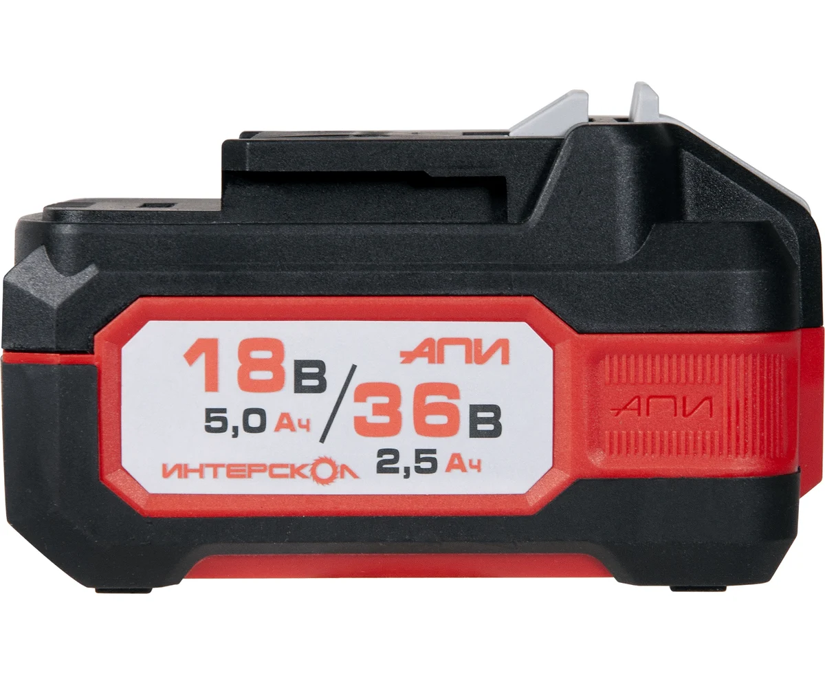 Важнейшая новинка аккумуляторной платформы ИНТЕРСКОЛ – литий-ионные аккумуляторные батареи слайдерного типа АПИ 18/36 В и емкостью 5,0/2,5 А∙ч. Их уникальность заключается в способности работать с инструментом, рассчитанным на номинальное напряжение как 18 В, так и 36 В, причем переключение происходит автоматически, полностью исключая вероятность ошибки пользователя.