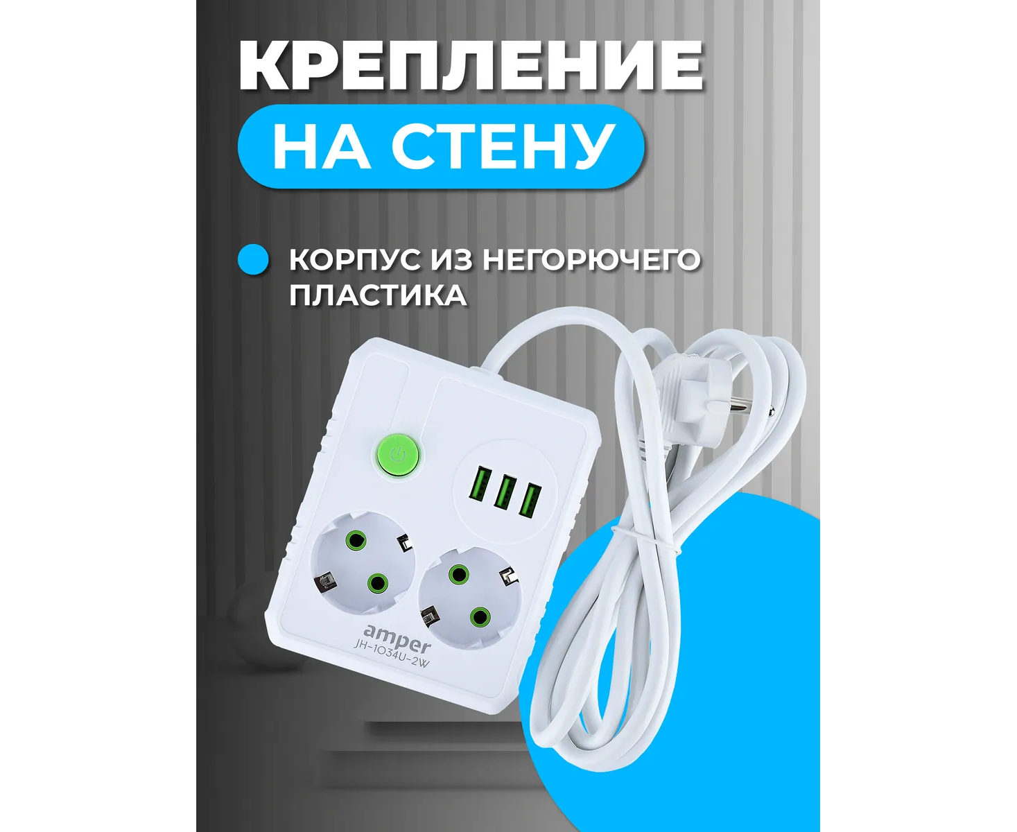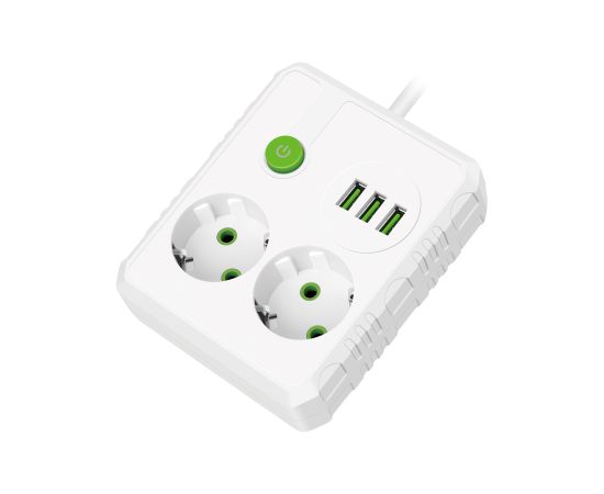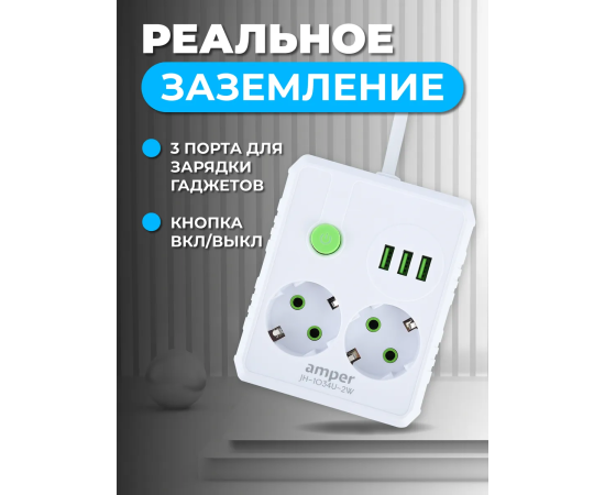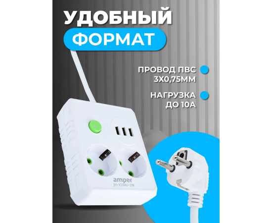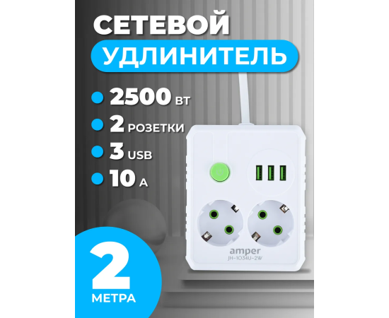 Сетевой удлинитель Amper , 2,0м, 2 розетки, 10А, 2500 Вт, 3usb, белый