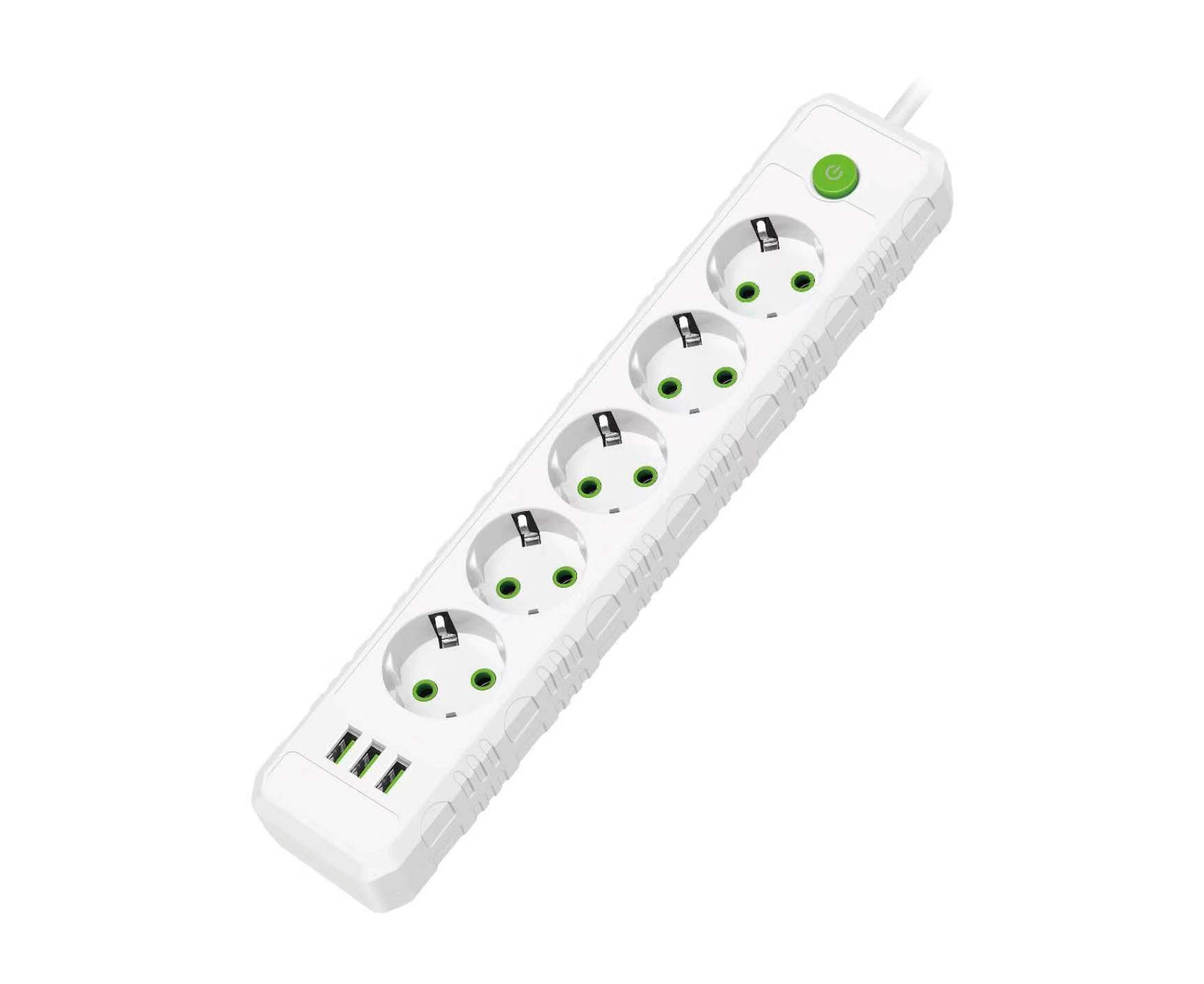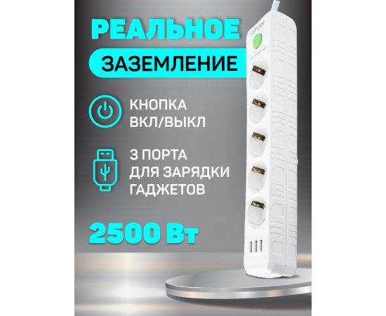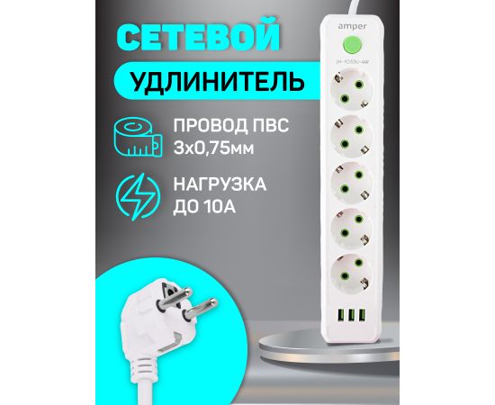 Сетевой удлинитель Amper , 4,0м, 5 розеток, 10А, 2500 Вт, 3usb, белый