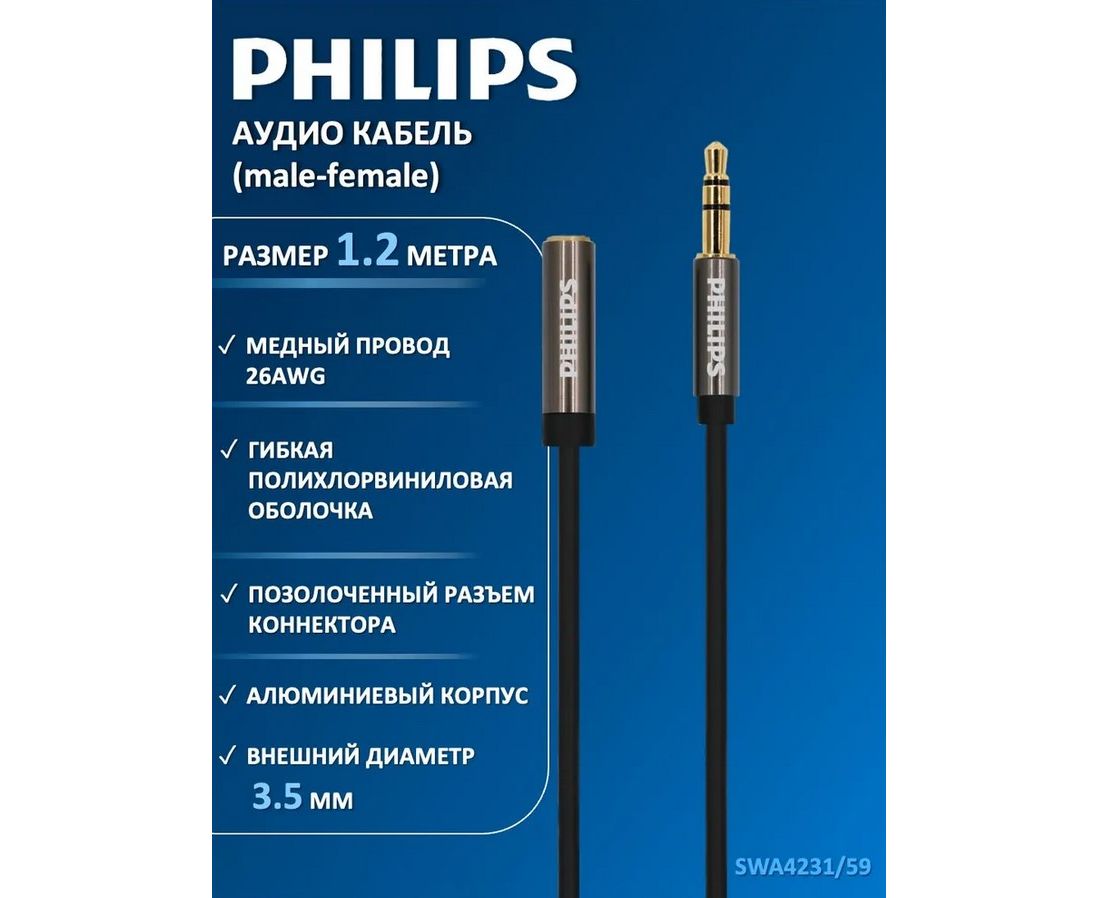 Аудио кабель Philips SWA4231/59, 3.5 мм, (male-female), серый, 1.2 м для передачи звука с одного устройства на другое. С помощью разъема aux вы сможете подключить акустическую систему, наушники или колонки к компьютеру, тв, смартфону или планшету и получить желаемый звук. Достаточная длина прочного кабеля 1,2 метра позволит подключиться к аудиоразъему на системном блоке компьютера или просматривать телевизор в наушниках. Высокое качество коннекторов - проводник из бескислородной меди высокой очистки для наилучшего качества передачи сигнала.