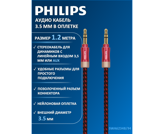 Аудио кабель Philips SWA6234B/94, 3.5 мм, в оплетке, красный, 1.2 м для передачи звука между устройствами с выходом mini jack 3.5. Акустический кабель подходит для смартфонов, планшетов, iPod, iPhone, Samsung, наушников, портативных колонок, автомобильной аудиосистемы и музыкальных центров. Аудио-кабель JACK M - JACK M оптимальной длины 1.2 метра в мягкой нейлоновой оплетке и высоким качеством коннекторов, отлично подходит для различных температурных режимов и остается гибким и прочным во всевозможных условиях и ситуациях. Проводник из бескислородной меди высокой очистки для наилучшего качества передачи сигнала. Позолоченное напыление обеспечивает лучшую проводимость, меньшее сопротивление и окисляемость.