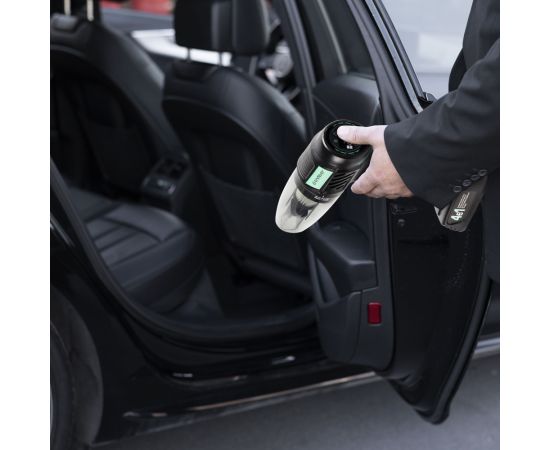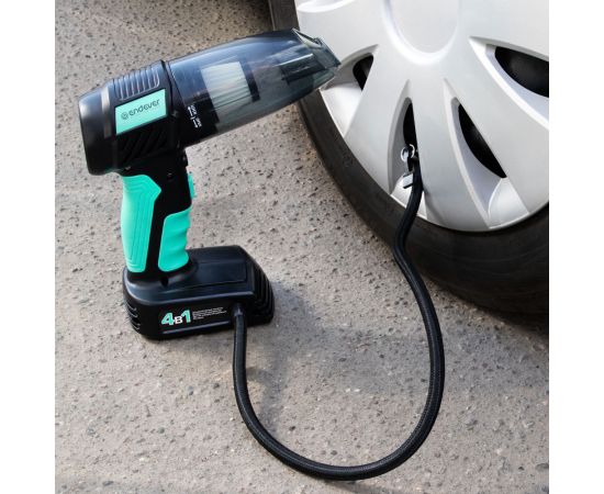 Время работы пылесоса: 20 мин, Время работы компрессора: 40 мин, Время зарядки: 2.5 ч, Скорость накачивания: 20 л/мин., 4 в1: аккумуляторный пылесос, светодиодный фонарик, компрессор, датчик измерения давления, 5 автоматических режимов компрессора: мяч, велосипедные шины, мотоциклетные шины, автомобильные шины, шины для пикапов, Переключаемая единица измерения: PSI, BAR, KPA, кг/см², Прорезиненная мягкая ручка, Высокоскоростной двигатель, Моющийся съемный контейнер для сбора пыли и воды