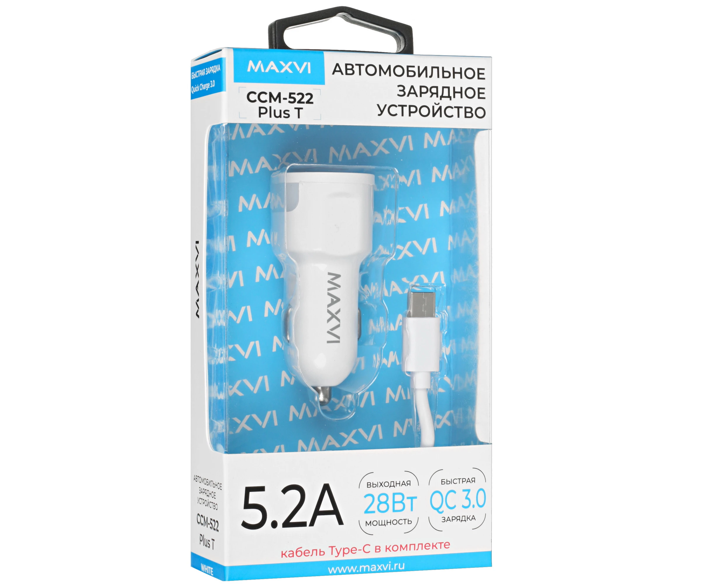 АЗУ Maxvi CCM-522 Plus T white 5.2A, 2xUSB, QC3.0 подсветка синяя