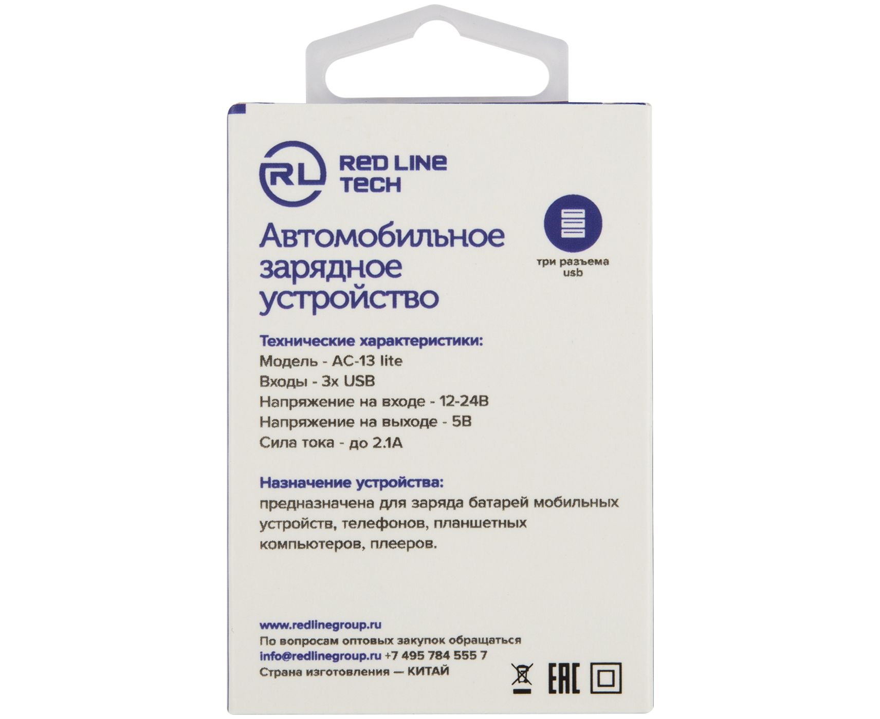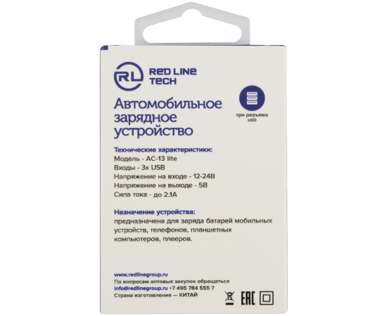 Автомобильное зарядное устройство Red Line Tech АС-13 Lite 3xUSB 1A Black в черном цвете ставится в прикуриватель автомобиля. Оно подходит для взаимодействия с разными смартфонами, планшетами и другими устройствами с использованием соответствующего провода. Зарядка выполнена в минималистичном дизайне, поэтому она не выделяется в автомобильном салоне. Напряжение - 12-24 В. Выходной ток составляет 5 А. Возможна одновременная зарядка трех гаджетов.