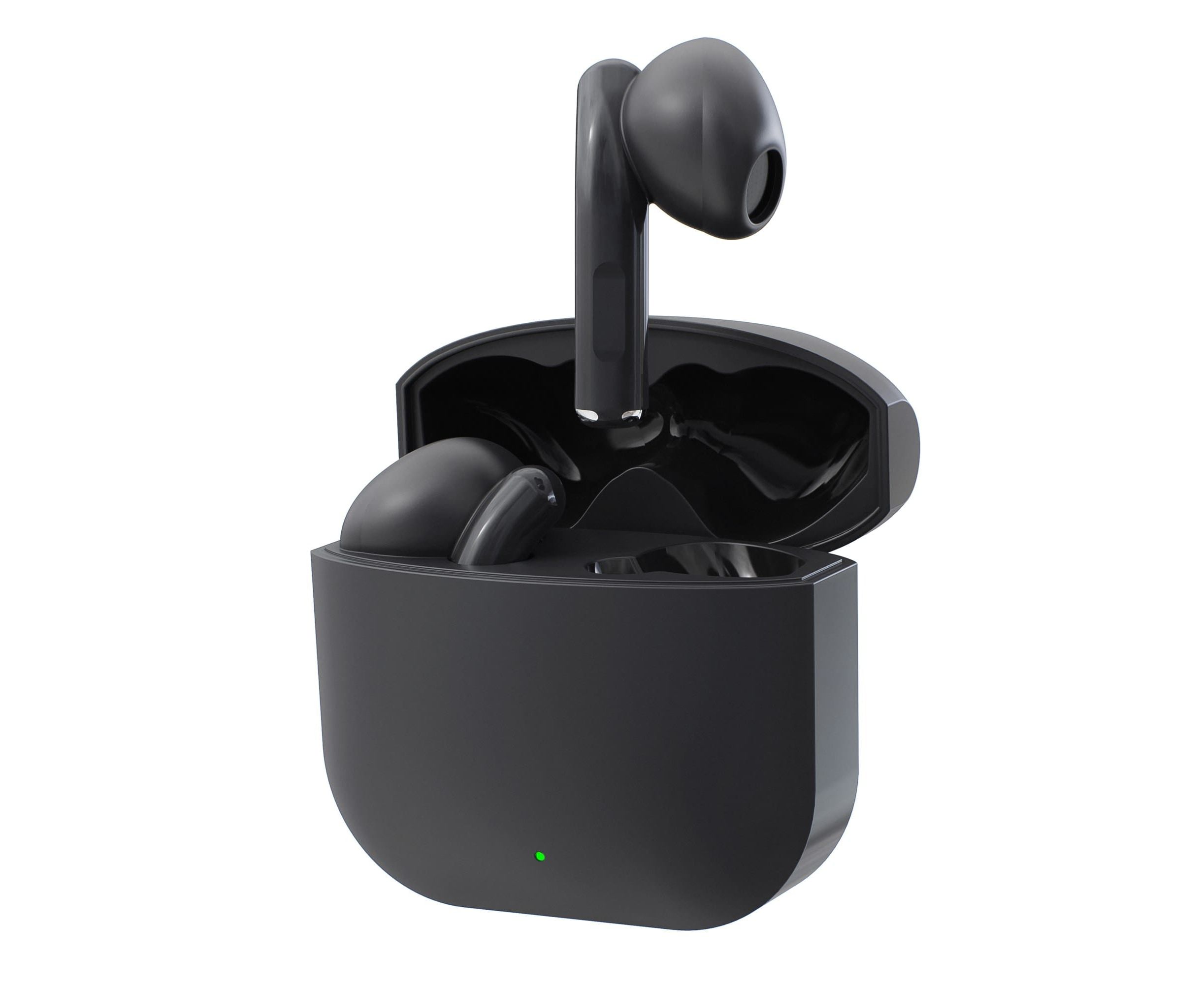 Устройство выполнено из матового пластика черного цвета. Радиус действия у данной модели - 15 метров. Кейс поддерживает функцию беспроводной зарядки, кабель USB C входит в комплект.
