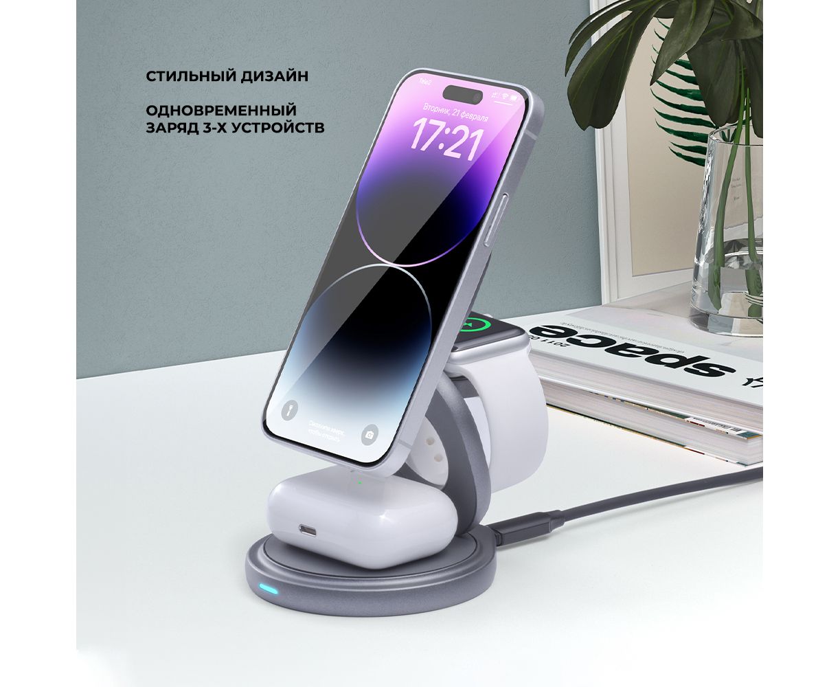 Беспроводная зарядная станция 3 в 1 MagSafe Rotation QI складная, графит, Deppa