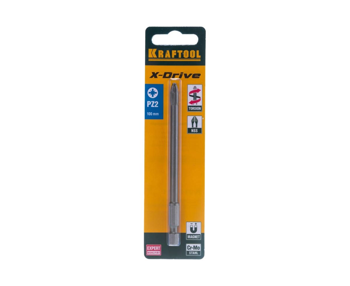 Биты KRAFTOOL X-Drive 26123-2-100-1, торсионные кованые, обточенные Cr-Mo сталь, тип хвостовика E 1/4, PZ2, 100мм, 1шт