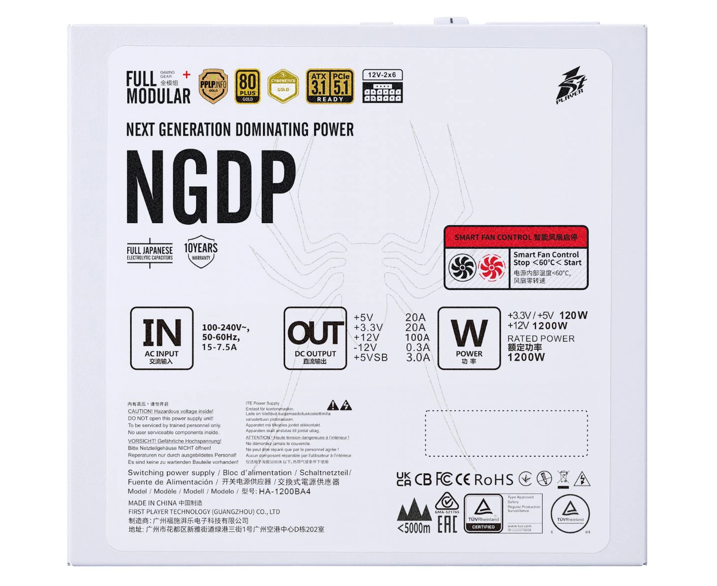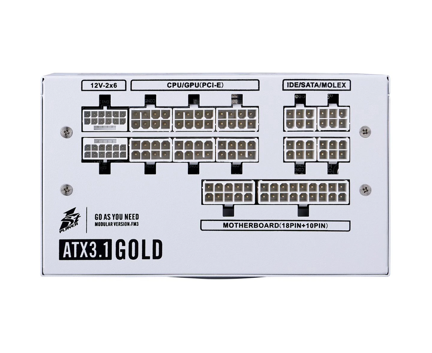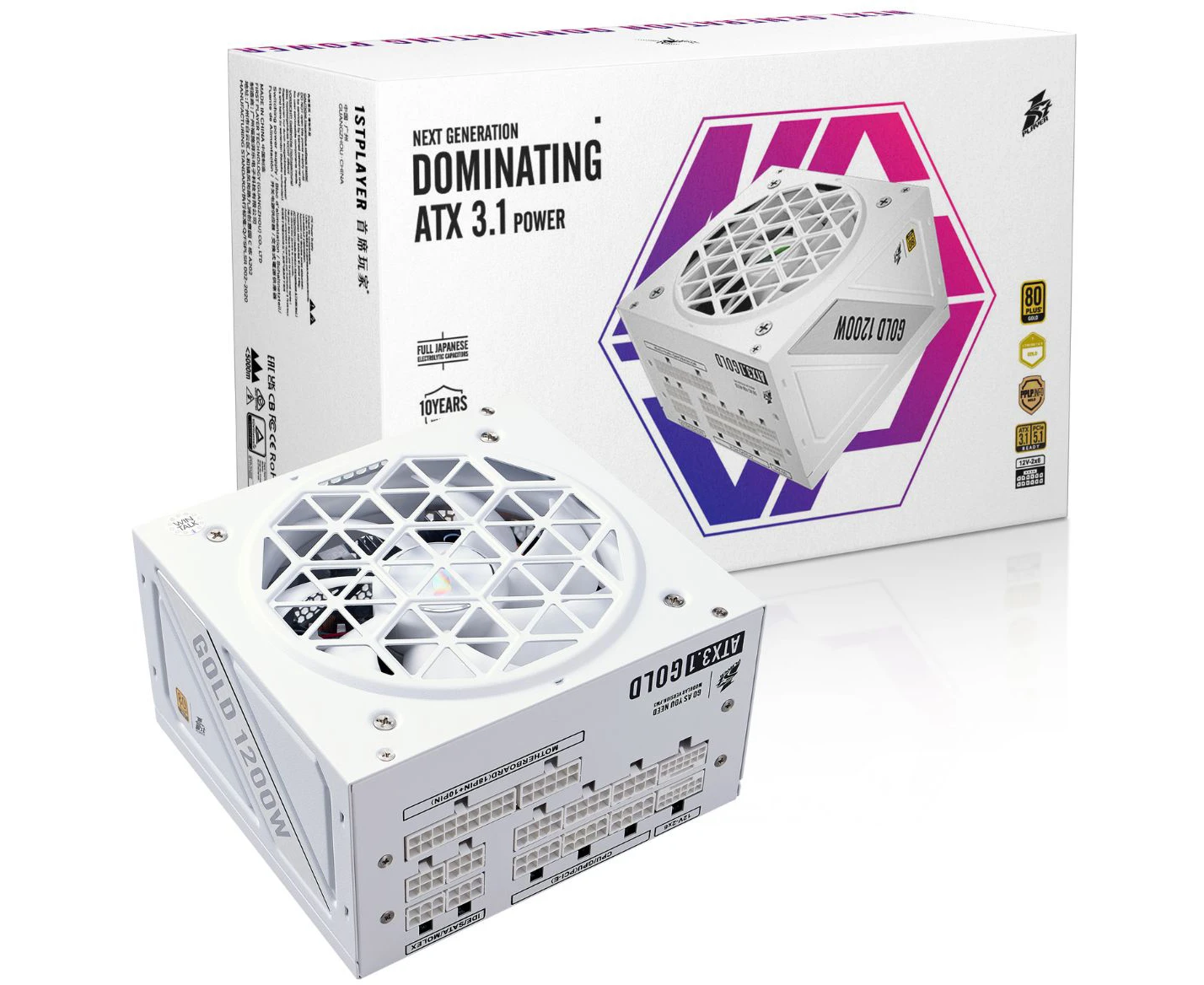 Блок питания 1STPLAYER NGDP Gold 1200W White (HA-1200BA4-WH) / ATX 3.1, PCle 5.1, APFC, 80 Plus Gold, LLC+DC-DC, 120mm fan, full modular