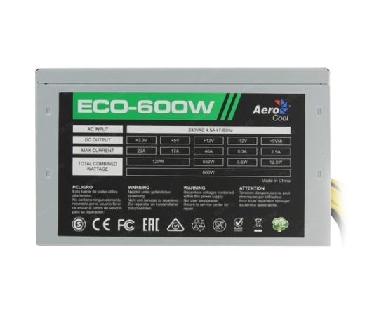 Блок питания Aerocool ECO-600W ATX v2.3 Haswell, fan 12cm, 400mm cable, power cord, 20+4P, 12V 4+4P, 1x PCI-E 6+2P, 4x SATA, 3x PATA, 1x F