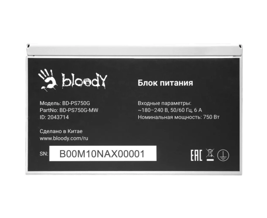 Блок питания BLOODY BD-PS750G (BD-PS750G-MW), 750Вт, 120мм, белый, retail