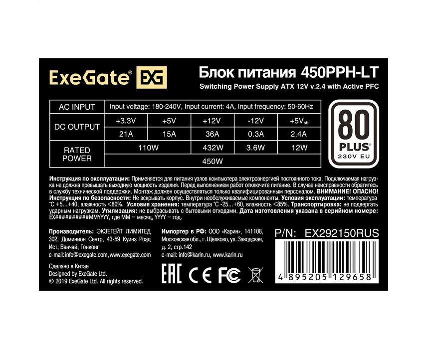 Блок питания ExeGate 450PPH-LT EX292150RUS 450W ATX, APFC, КПД 82 (80 Plus), 12cm fan, 24pin, (4+4)pin, PCIe, 5xSATA, 3xIDE, RTL, black