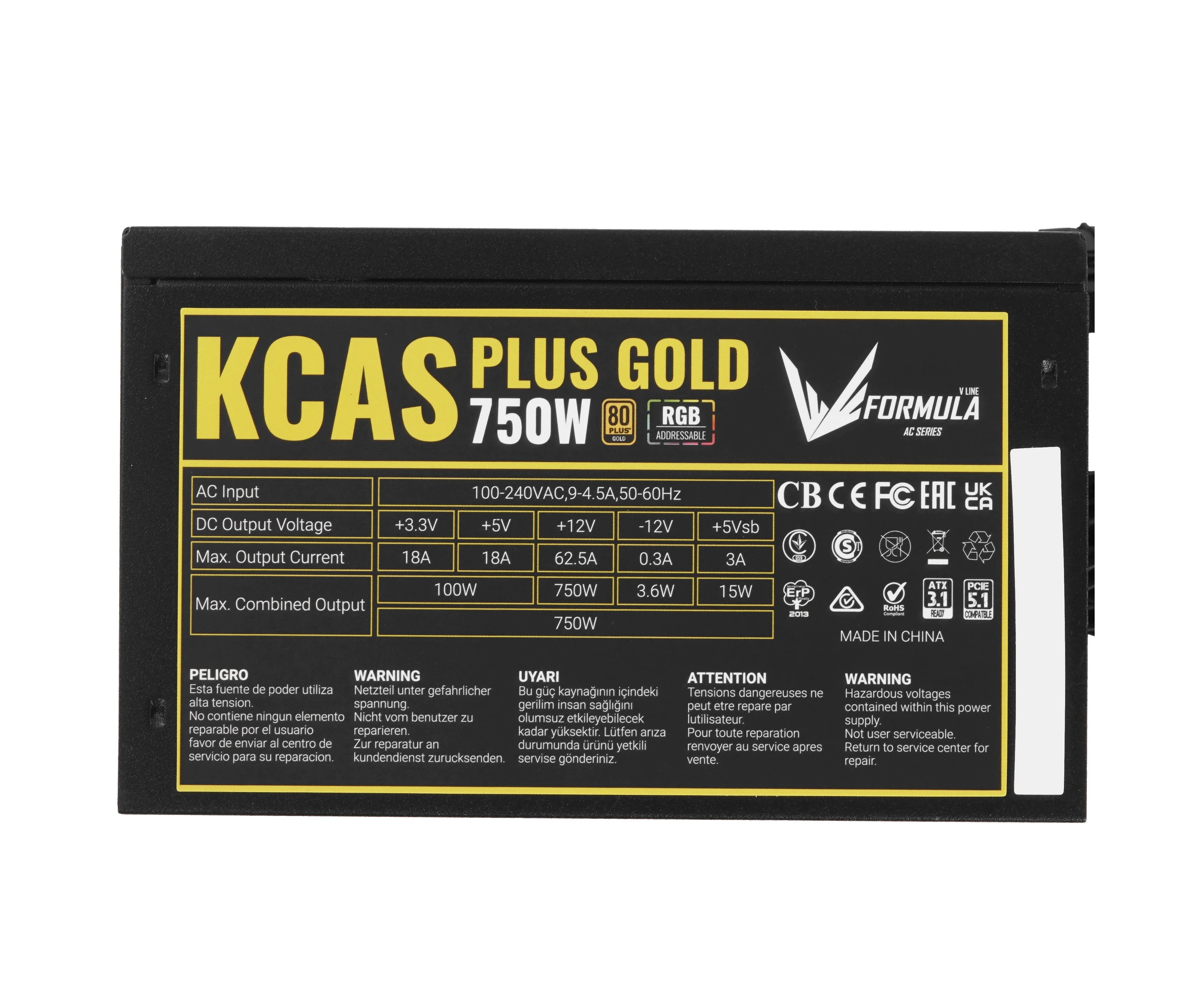 Блок питания Formula V Line KCAS Plus Gold 750W RGB, 750W, ATX3.1/PCIe5.1, APFC, 80+ Gold, 12cm Fan
