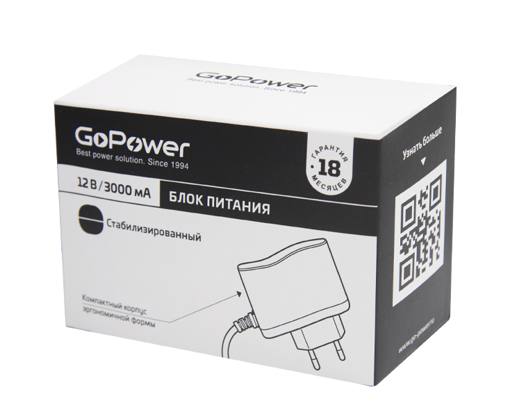 Блок питания GoPower 3.0A 12V 5,5x2,5/12мм импульсный (1/90)