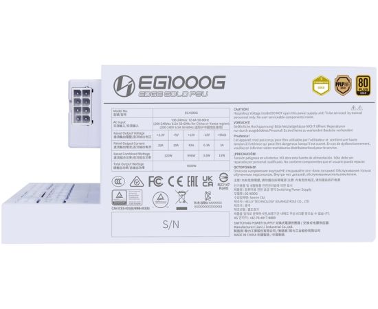 Блок питания Lian Li EG1000G (G9P.EG1000G.WH00.RU) / White / ATX 3.1, 1000W, 80 Plus Gold, PCIe 5.1, APFC, USB/Fan HUB, 120mm FDB Fan, Fully Modular