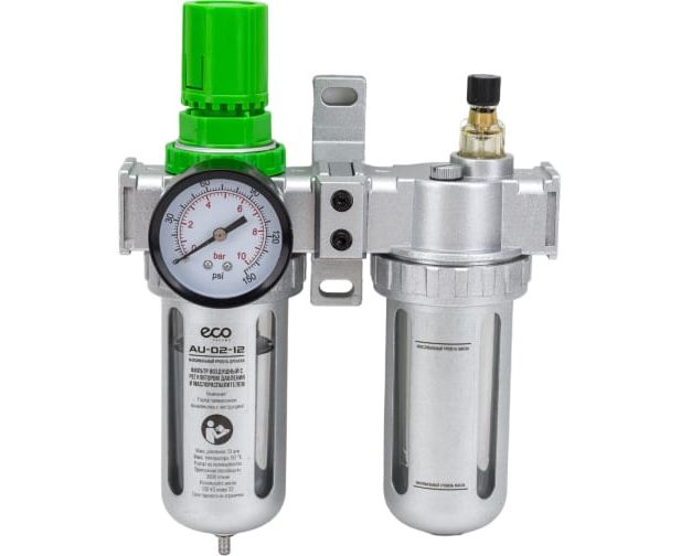Блок подготовки воздуха с регулятором давления и маслораспылителем 1/2" ECO AU-02-12 рекомендуется использовать для очистки воздуха от пыли и влаги, а также насыщения его парами масла для улучшения работы редукторов силового пневмоинструмента: импульсных гайковертов, трещоточных ключей, дрелей и шлифмашин.