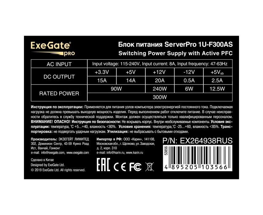 Блоки питания Exegate ServerPro-1U-F300AS EX264938RUS 300W, APFC, унив. для Flex1U, 24pin, 4pin,3xSATA, 2xIDE