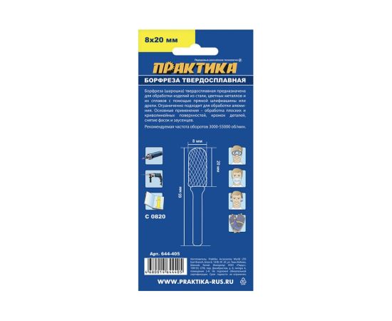 Борфреза твердосплавная Практика тип C цилиндрическая с закруглением (644-405) 8 х 20 мм, хвостовик 6 мм