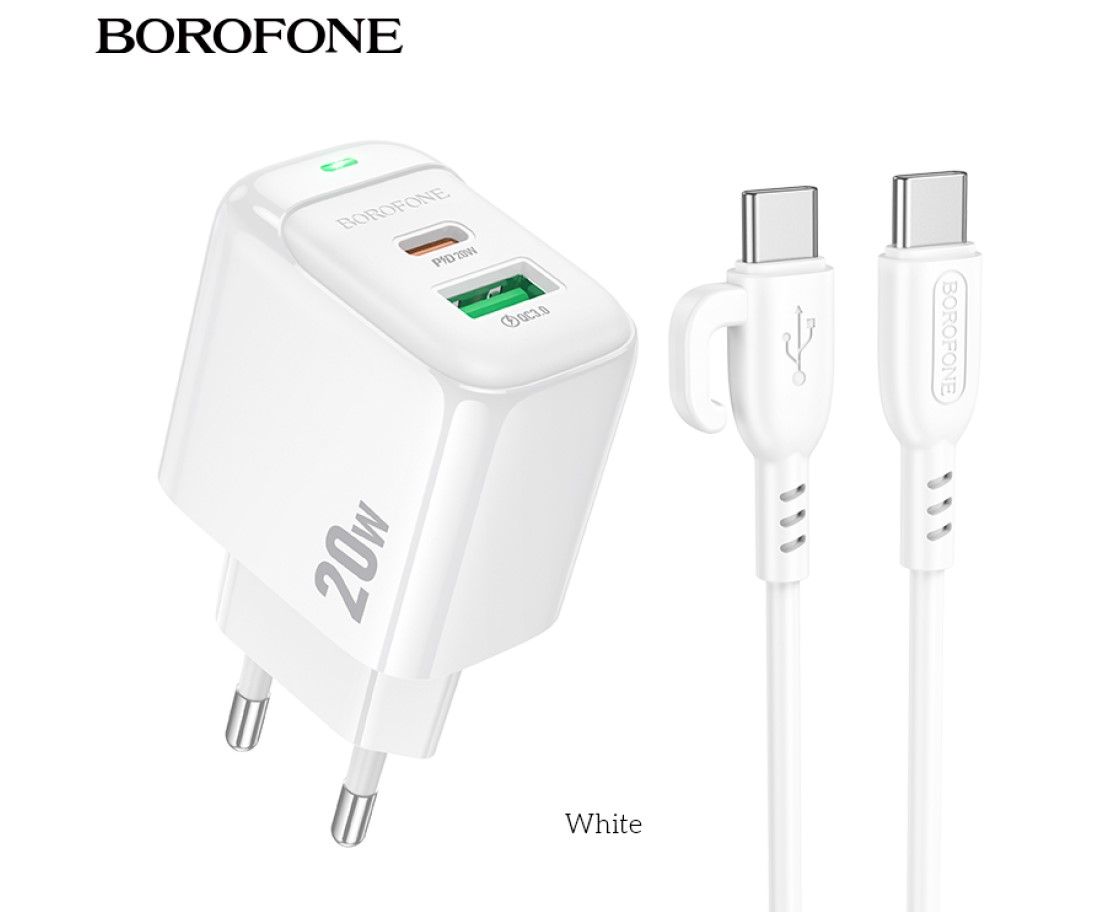 Сетевое зарядное устройство BOROFONE BAS44A/ СЗУ + кабель C-C 1m/PD + QC 3.0/ 2 USB: Type-C + Type-A/ Выход: 20W + 18W/ Белый