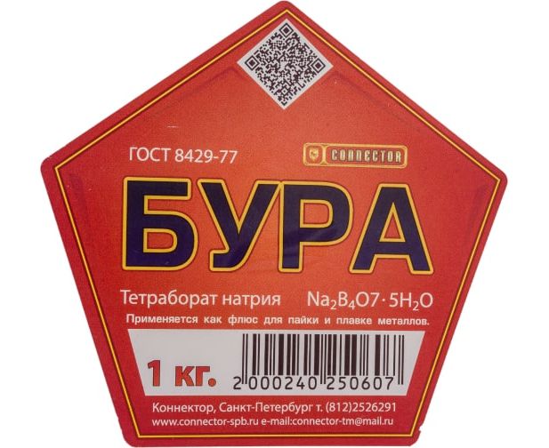 Бура Connector BYRA-1000 предназначена для удаления оксидов с поверхности под пайку, улучшения растекания жидкого припоя при пайке медью, медноцинковыми, медноникелевыми припоями, а также для углеродистых сталей, чугуна и меди. Представляет собой сыпучий, бесцветный, кристаллический порошок тетрабората натрия.