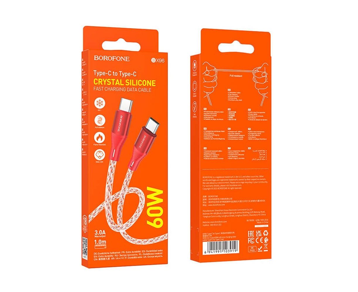Дата-кабель BOROFONE BX96 Ice crystal 60W silicone charging data cable Type-C to Type-C (красный)