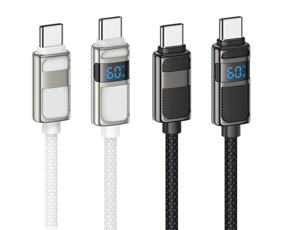 U137 Line, Type-C на Type-C зарядный дата кабель, поддержка быстрой зарядки PD 60W, LED цифровой дисплей, нейлоновая оплётка и коннекторы из цинкового сплава, длина – 1.2м