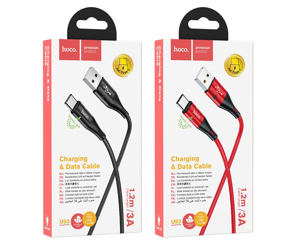 U93 Shadow кабель для зарядки и передачи данных USB на Type-C, 1.2м, ток до 3.0A, двойной индикатор