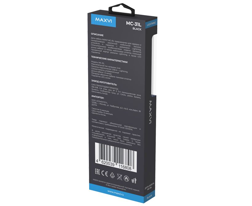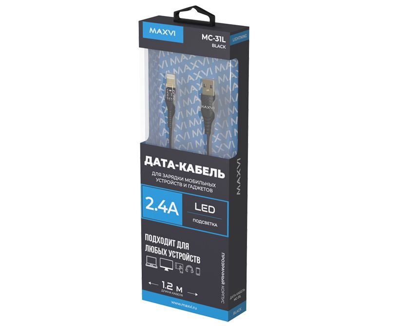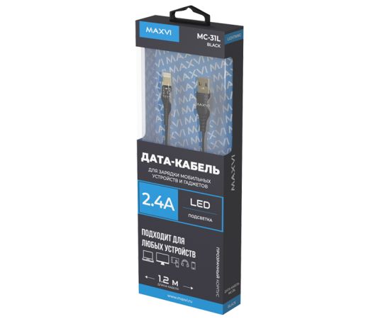 Дата-кабель Maxvi MC-31L USB-Lightning 2.4А, прозрачный корпус, LED подсветка, 1.2м, black