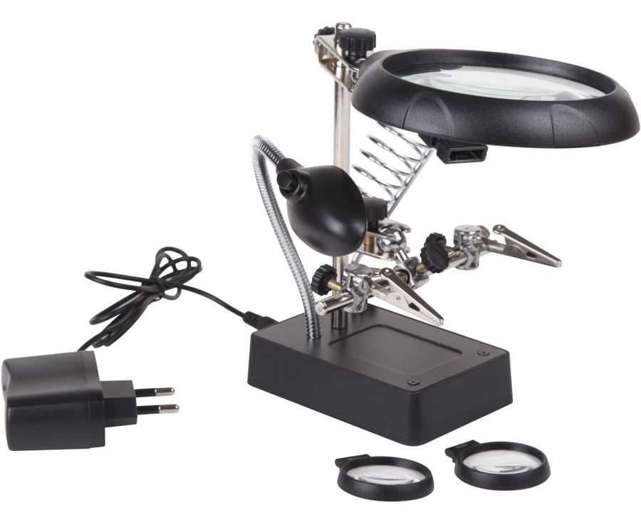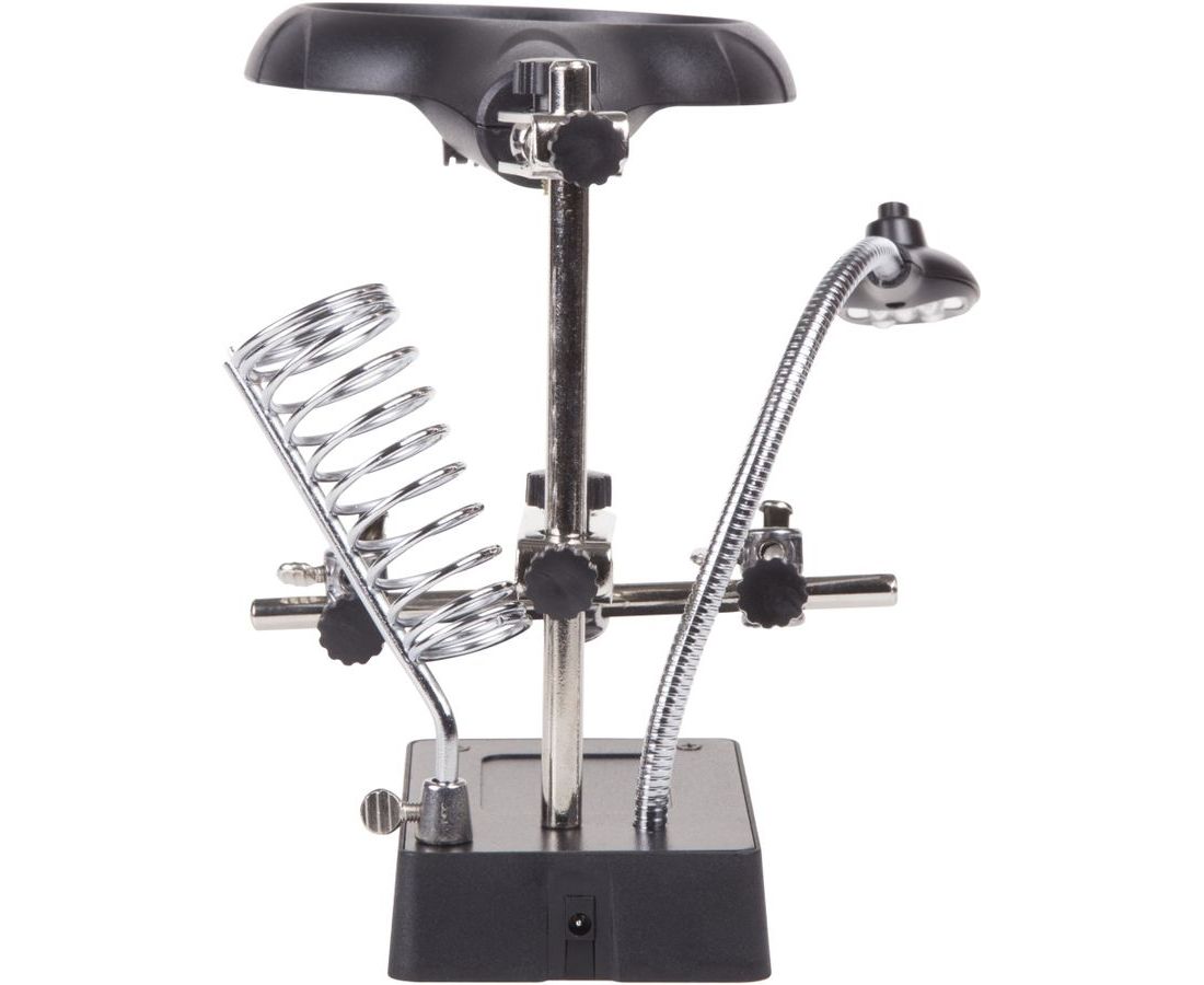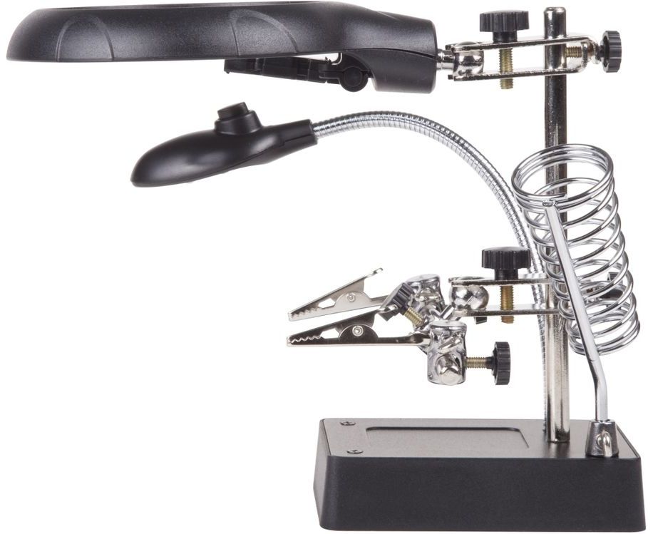 Третья рука идеальный помощник, при работе с мелкими деталями,когда не хватает двух рук. Модель с лупой х2.5 + х7.5, подставка под паяльник и LED подсветкой. С помощью лупы можно будет рассмотреть даже самые мелкие детали.