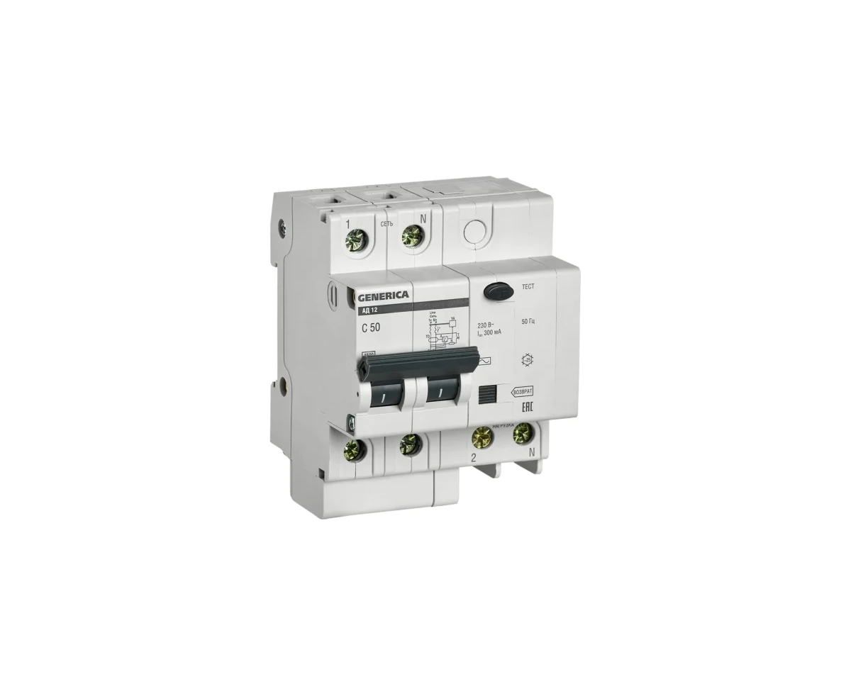 Дифавтомат IEK АД12 Generica (MAD15-2-050-C-300) 50A тип C 4.5kA 300мА AC 2П 230В 4мод серый (упак.:1шт)