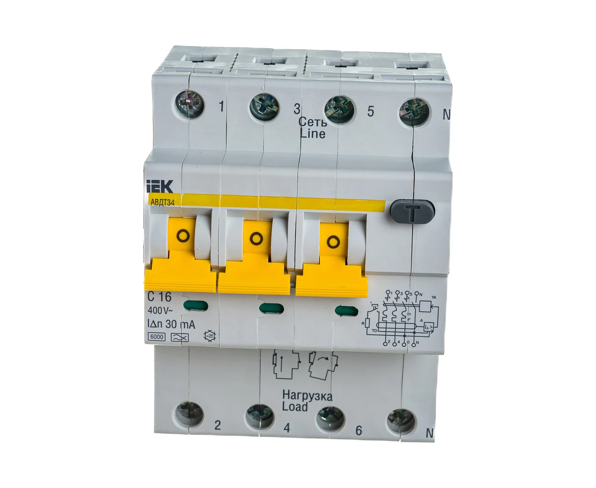 Дифавтомат IEK АВДТ 34 (MAD22-6-016-C-30) 16A тип C 6kA 30мА A 4П 400В 4мод белый (упак.:1шт)