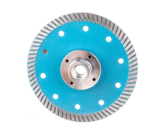 Особенности: фланец М-14 не только позволяет устанавливать данный диск на УШМ без зажимной гайки, но и значительно усиливает корпус диска, что дает возможность работать с материалом под любым углом, создавая дополнительные возможности в работе.