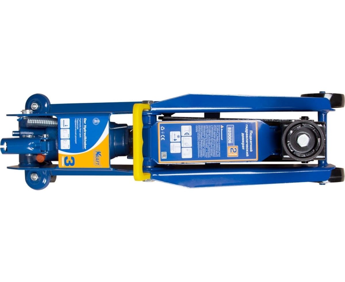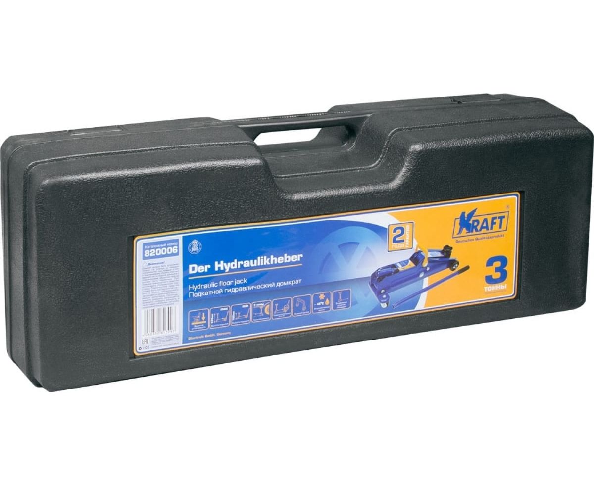 Подкатной гидравлический домкрат KRAFT 3 т, кейс KT 820006 предназначен для плавного поднятия автотранспорта при проведении ремонта и монтажа.