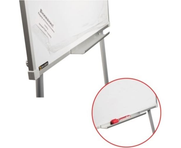 Снабжена полочкой для аксессуаров. Для защиты рабочей поверхности доски на нее нанесена защитная пленка. Перед началом работы необходимо удалить защитную пленку. При должном уходе за рабочей поверхностью при помощи чистящей жидкости-спрея и стирателей BRAUBERG поверхность доски-флипчарта прослужит более 10 лет.