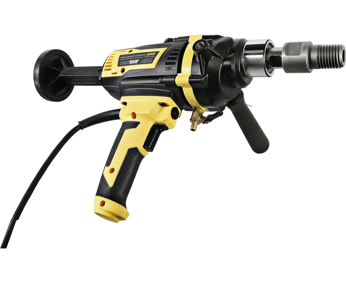 Применение в конструкции фирменных японских подшипников NSK повышенного ресурса способствует исправной и долговечной эксплуатации электроинструмента. Удобству в практическом обращении с дрелью содействует адаптер под алмазные коронки с хвостовиком 1 1/4", идущий в комплекте, фиксатор-липучка расположенный на кабеле и блокировка выключателя во включенном положении при длительных работах. Регулировка частоты вращения осуществляется усилием, приложенным к кнопке включения.