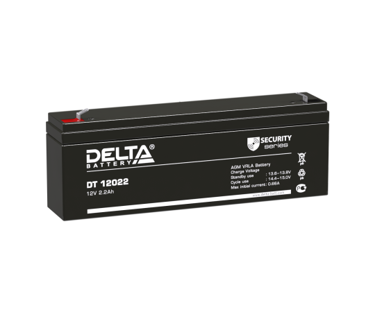 Герметизированный VRLA cвинцово-кислотный аккумулятор Delta DT 12022 напряжением 12В и емкостью 2.2Ач изготовлен по технологии AGM (с микропористым заполнителем, пропитанным электролитом). Корпус изготовлен из негорючего ABS пластика. Срок службы аккумулятора рассчитан на 3-5 лет работы. Аккумулятор предназначен для работы в режиме постоянного подзаряда (т.н. буферный режим), обладает низким внутренним сопротивлением и саморазрядом.