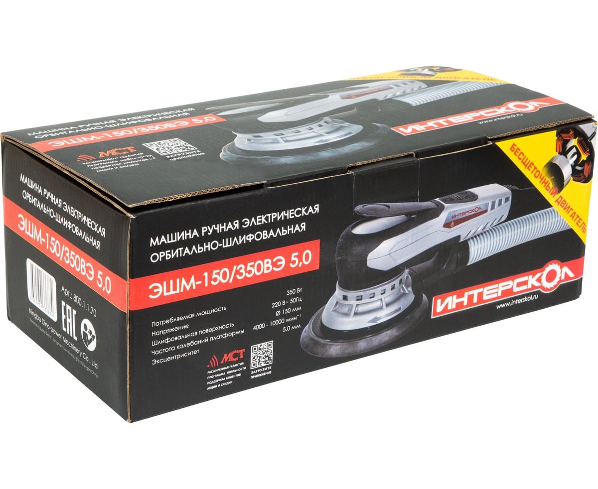 Эксцентриковые профессиональные шлифмашины ИНТЕРСКОЛ ЭШМ-150/350ВЭ оборудованы бесщеточным (вентильным) сетевым двигателем, работающим под управлением цифрового электронного блока. Повышенный коэффициент полезного действия двигателя и отсутствие редуктора обеспечивают шлифмашине высокую энергоэффективность и рекордно малый вес. В сочетании со схемой динамической балансировки это снижает массу изделия и позволяет оператору машины эффективно шлифовать длительное время не уставая. Эквивалентная мощность в пересчете на традиционную схему с коллекторным двигателем и редуктором составляет 600Вт, что достаточно практически для всех операций эксцентрикового шлифования. Продуманная конструкция пылеудаления при эксплуатации с пылесосом удаляет практически всю образующуюся при шлифовке пыль, повышая качество шлифовки и сохраняя чистоту на рабочем месте. Регулировка оборотов от 4000 об/мин до 10000 об/мин с шагом 1200 от/мин, эксцентриситет 5,0мм и тормоз тарелки обеспечивает как высокую эффективность шлифовки, так и финишное качество поверхности, потому что частицы абразива каждый раз проходят по новой траектории.