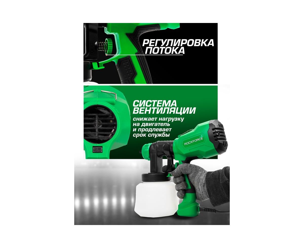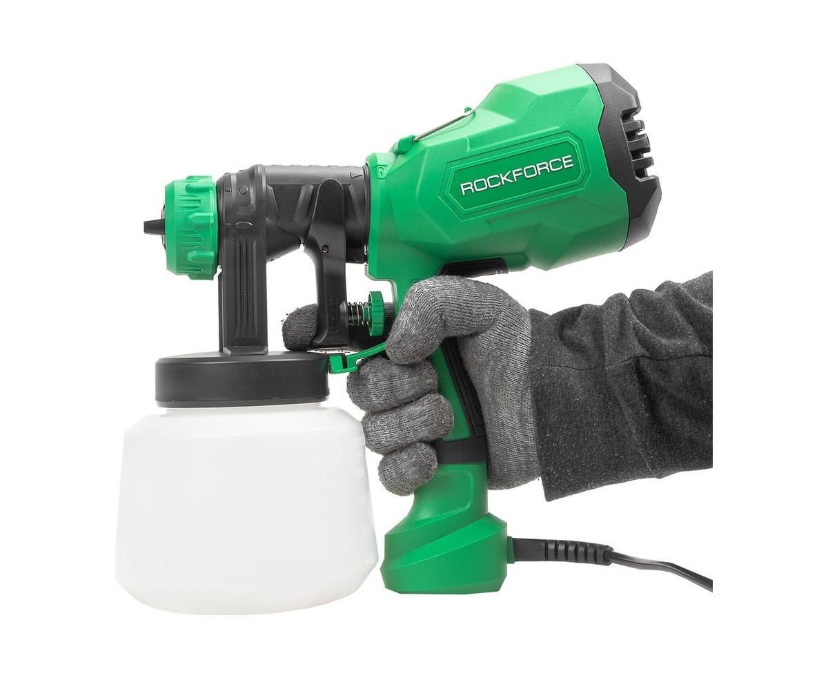 Краскопульт ручной электрический от бренда Rockforce необходим для покрытия разнообразных поверхностей лакокрасочными материалами.