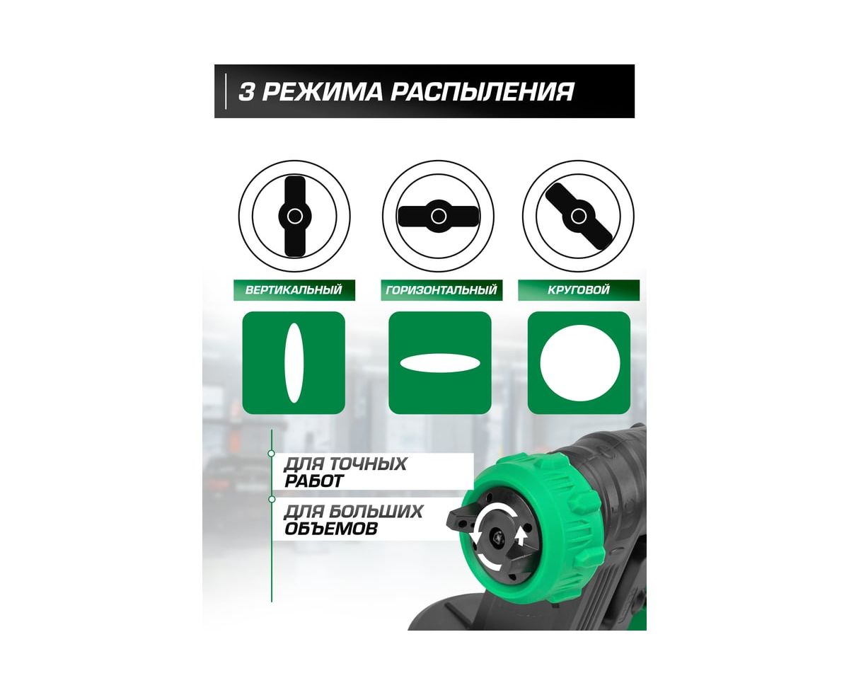 Удобство использования. Под давлением встроенного насоса из малярного инструмента выделяется краска. С помощью краскопульта электрического можно наносить побелку, полироль, морилку, грунтовку, лак, масло и многое другое. Сопло плотно прилегает к конструкции аппарата без зазоров, что защищает от подтеков. Также краскопульт оборудован винтом для регулировки расхода краски. Краскопульт имеет 3 варианта распыления, который выбирается благодаря вращению подвижной части распылительной головки: вертикальный и горизонтальный овал или круг. Воздушный тип двигателя электрокраскопульта обеспечивает качественную покраску: лакокрасочные материалы наносятся тонким и равномерным слоем.