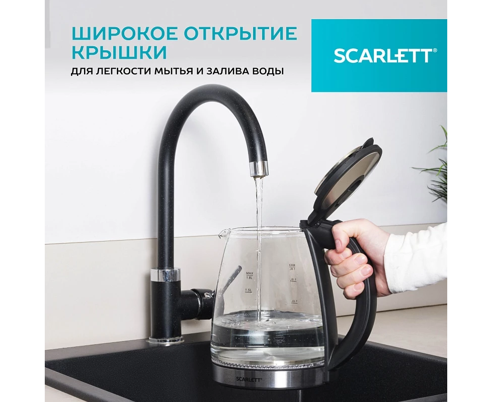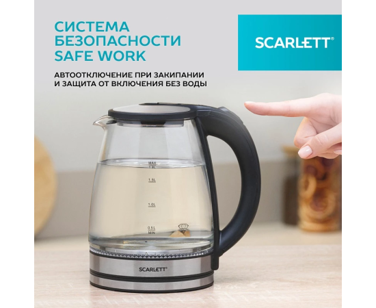 Электрический чайник Scarlett SC-EK27G103 обеспечивает надежное и безопасное использование. Внутренняя подсветка позволяет удобно пользоваться прибором даже при слабом освещении. Объём чайника составляет 1,8 литра. Шнур удобно убирается в специальный отсек в базе прибора. Система безопасности Safe Work – автоматическое отключение при закипании воды, защита от включения при отсутствии воды в чайнике.