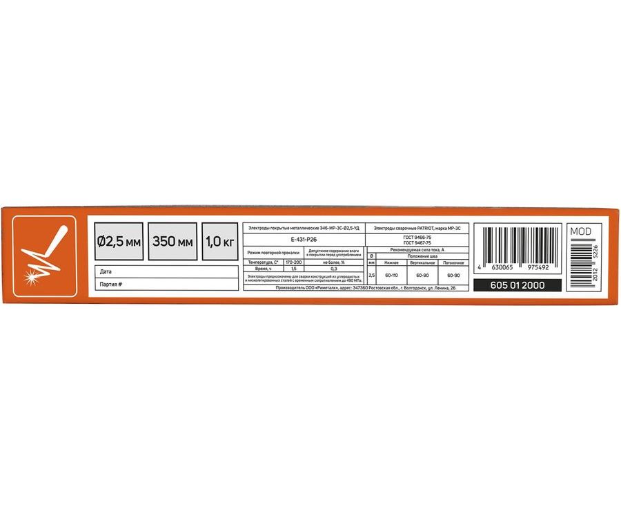 Электроды PATRIOT МР-3С, диам. 2,5мм, длина 350мм, уп. 1кг (605012000)