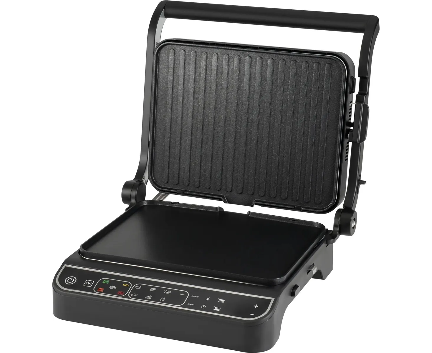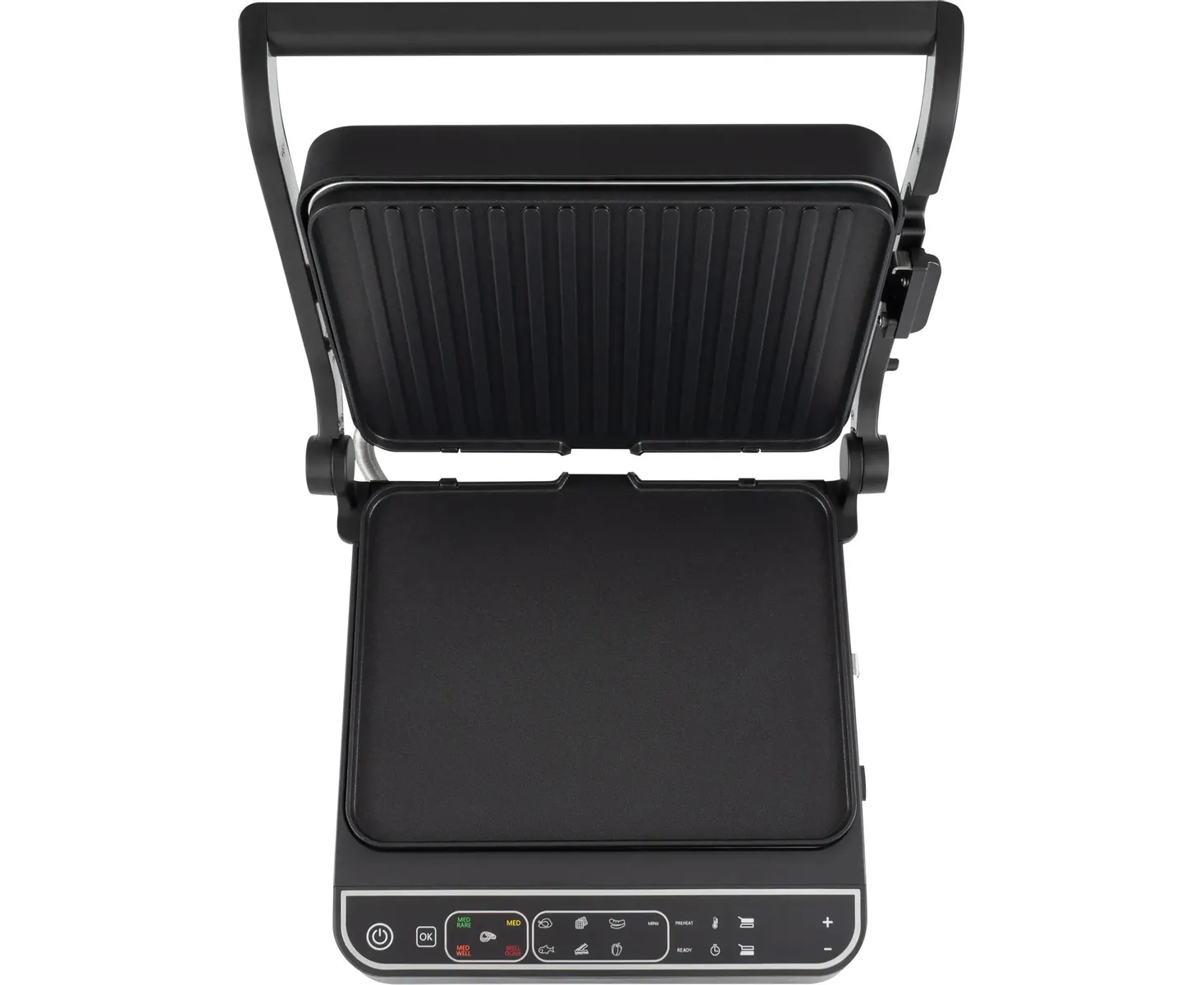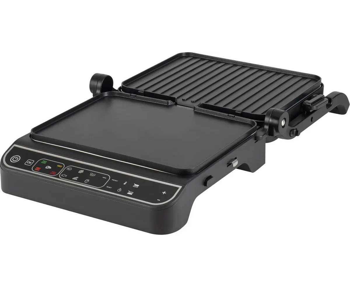 Термощуп обеспечивает автоматический контроль температуры внутри стейка, тем самым контролирует степень прожарки. 10 автоматических программ для приготовления, а так же ручной режим, для оптимальных настроек для каждого типа продуктов. Открытие на 180°, плоская панель и раздельная регулировка температуры панелей, позволяет использовать гриль как плиту.