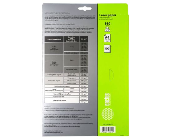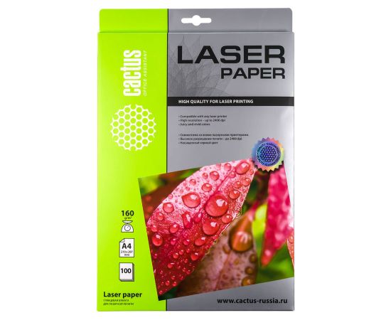 Фотобумага Cactus CS-LPA4160100 A4/160г/м2/100л/белый глянцевое для лазерной печати