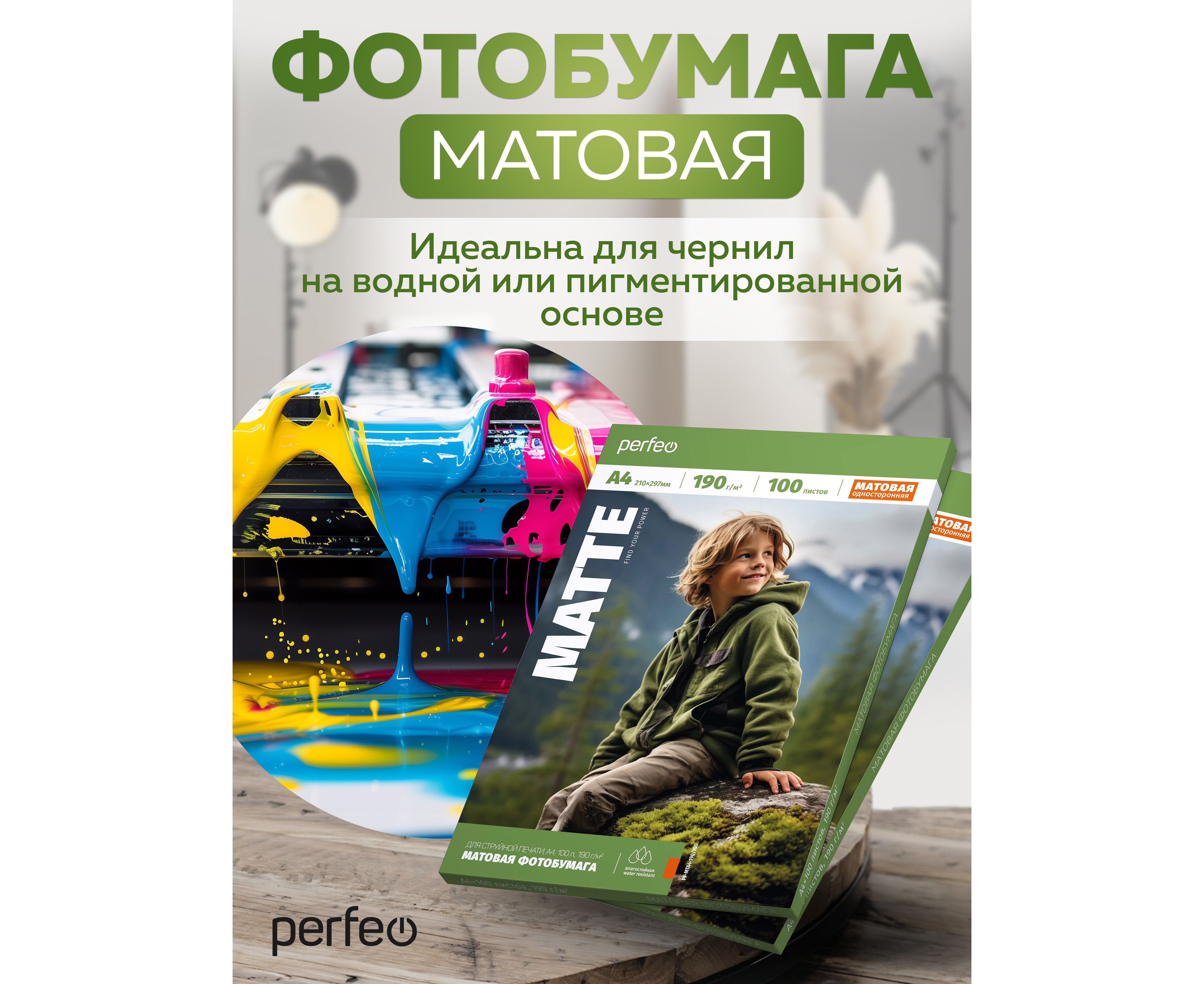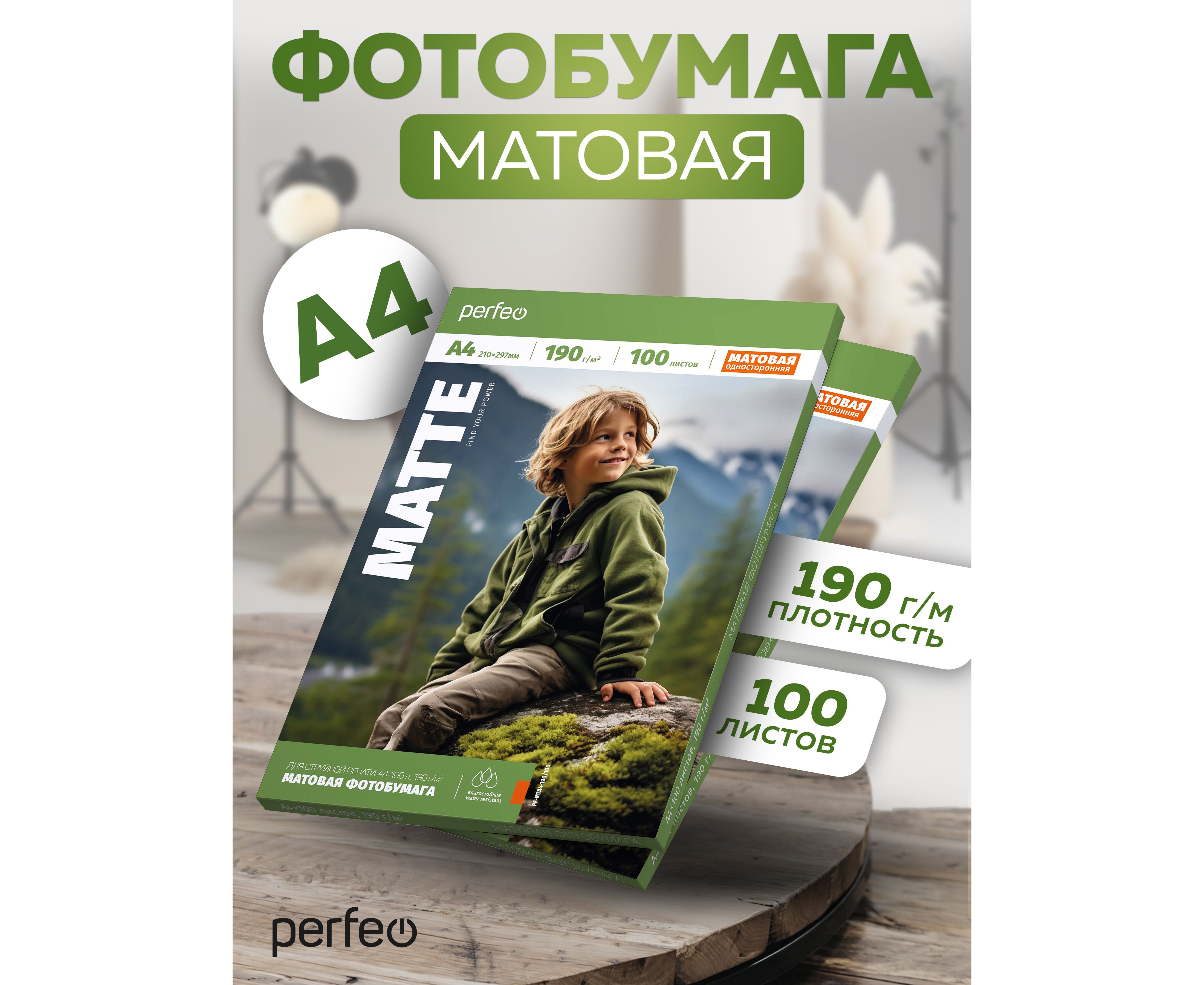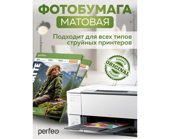 Высококачественная матовая (matte) фотобумага A4 (стандартный альбомный лист) производится на немецком оборудовании с использованием последних, передовых технологий в обработке и производстве фотобумаги. Фотобумага Perfeo формата А4 в упаковке по 100 шт. плотностью 190 гр/м2, предназначена для бизнес процессов фотолабораторий и фото студий. Идеально подходит для создания различных изображений, фотографий, рекламных материалов, брошюр и документов. Матовое покрытие из специального полимерного верхнего слоя со светоотражающим слоем, обеспечивает яркие, насыщенные цвета, защищает от влажности и света, предотвращает от растекания краски при печати. Высокая плотность бумаги позволяет создавать отпечатки профессионального качества, а также, благодаря своему особому составу обеспечивает высокое разрешение и детализацию изображений с максимальным разрешением до 5760 DPI (точек на дюйм). Предназначена для печати на любых струйных принтерах таких производителей как EPSON, HP, Canon, Lexmark, Brother, Xiaomi. Так же бумага обладает очень важной характеристикой для струйной печати - быстрая впитываемость и высыхание чернил. При печати на нашей бумаге Вы получите насыщенный и глубокий чёрный цвет. Идеальна для чернил на водной и пигментной основе. Бумага 190 гр/м2 относится к плотной фотобумаге. Подходит для печати фотографий.